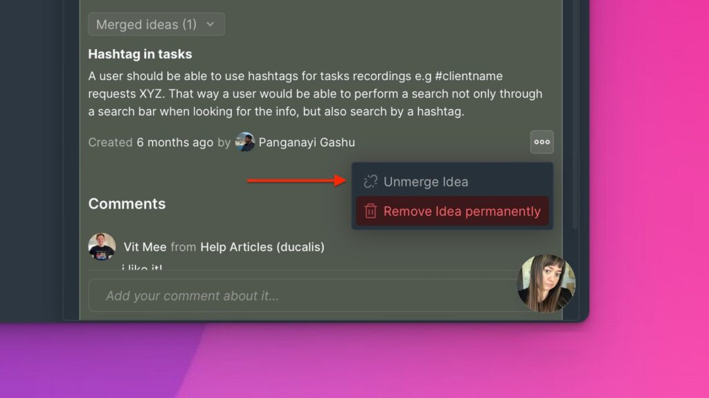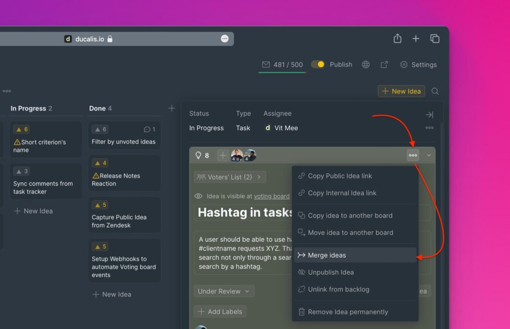 Um zu vermeiden, dass ähnliche Ideen auf deinen Voting Boards erscheinen, haben wir die Möglichkeit hinzugefügt, doppelte Ideen zusammenzuführen.