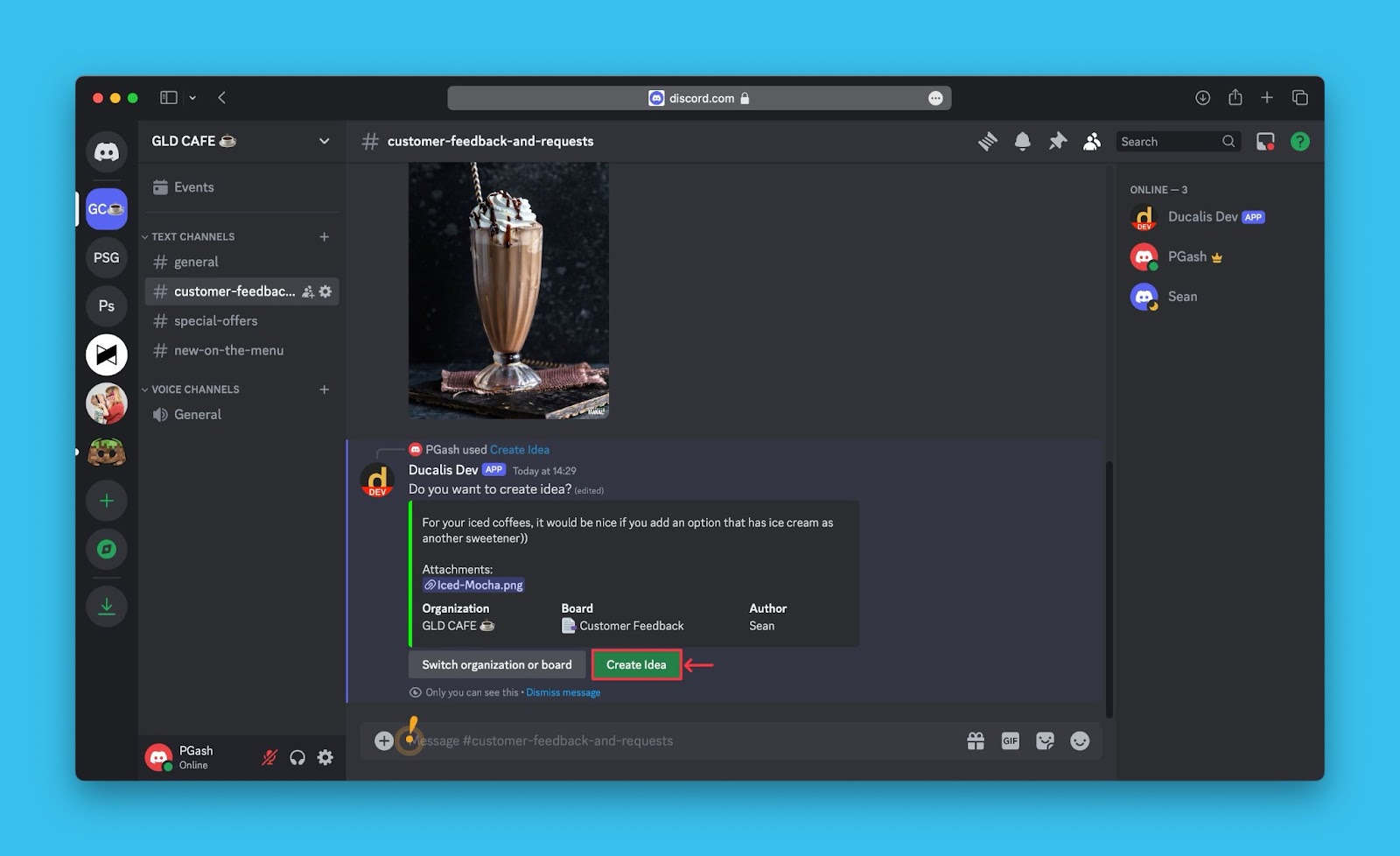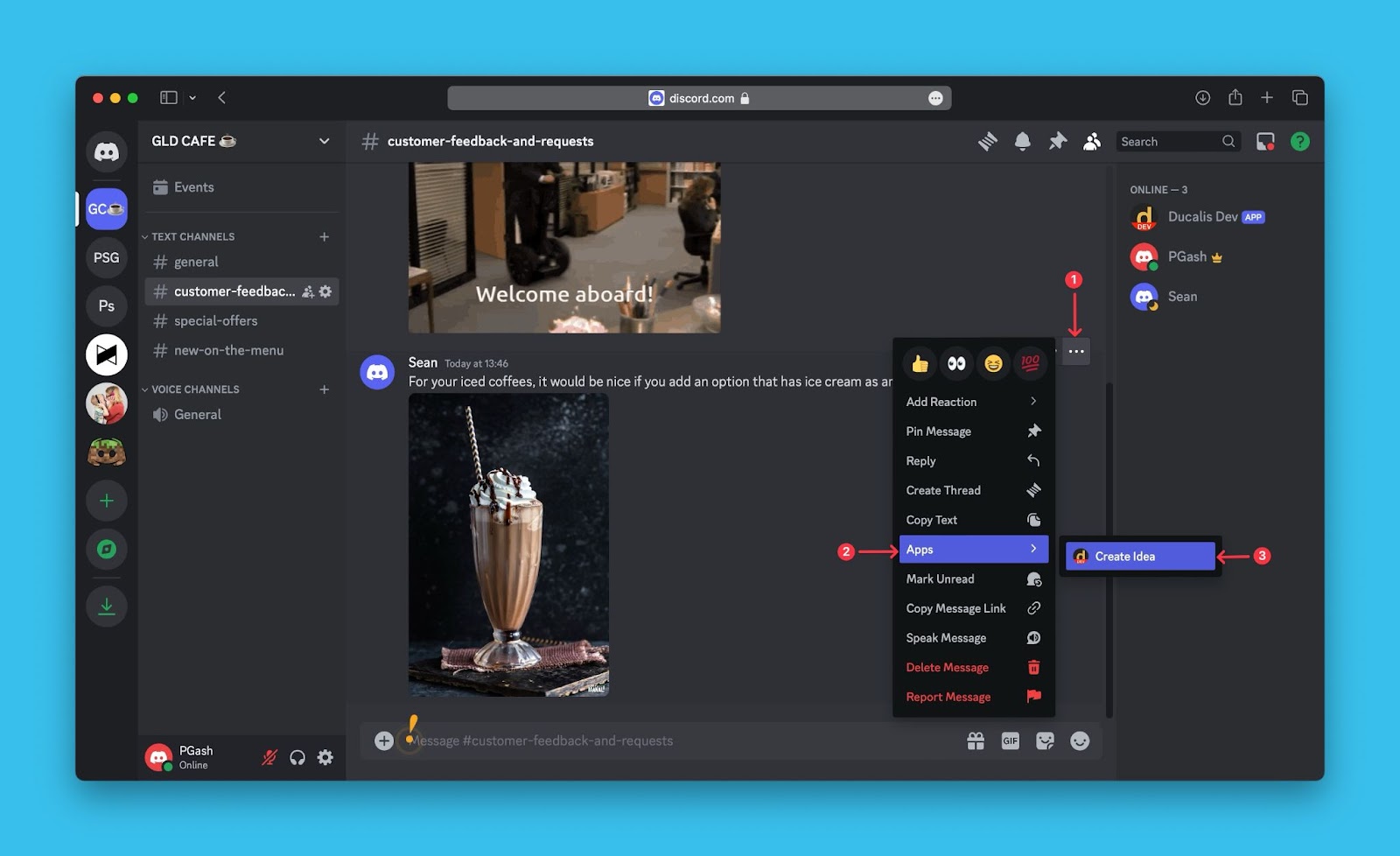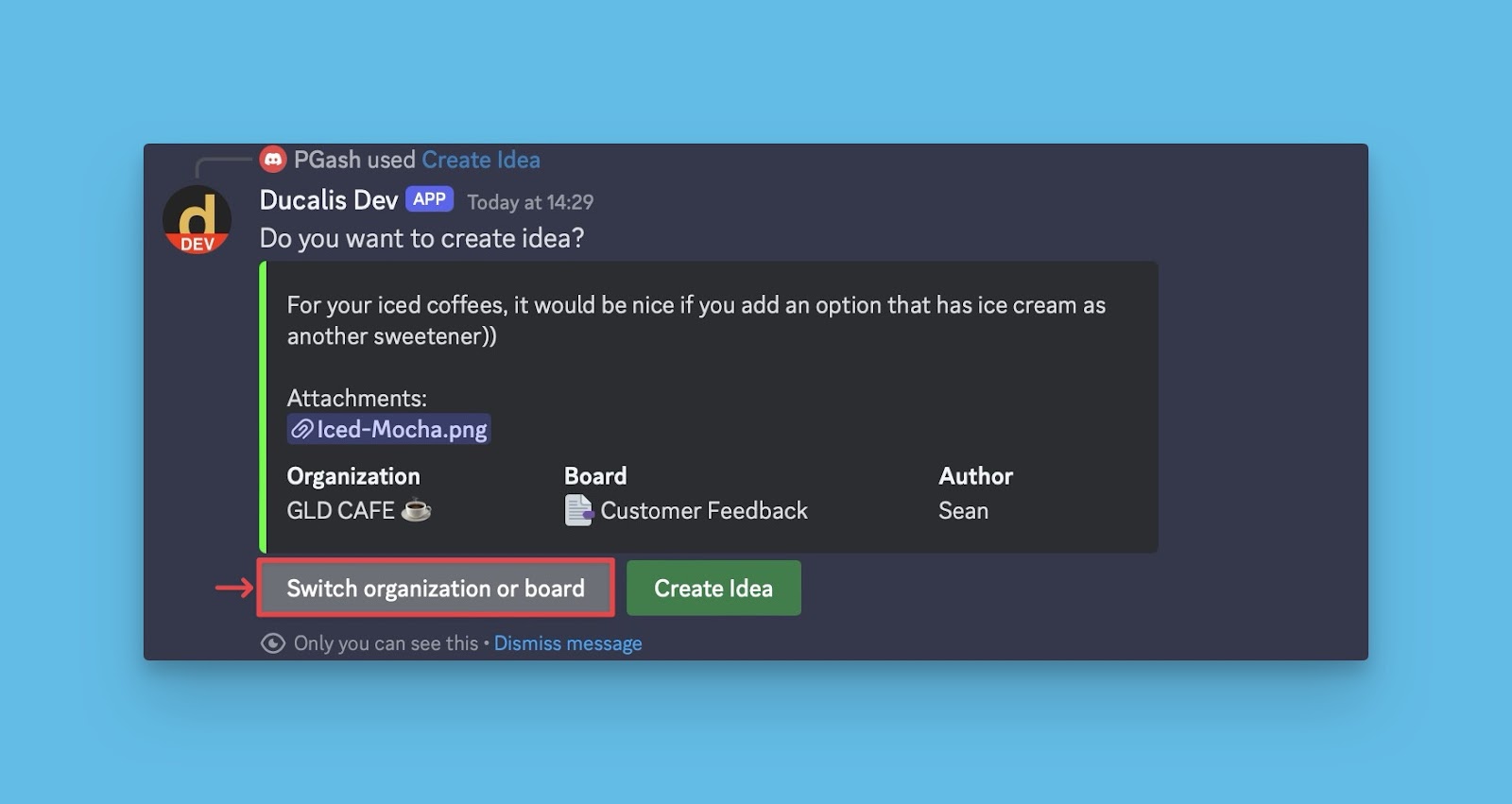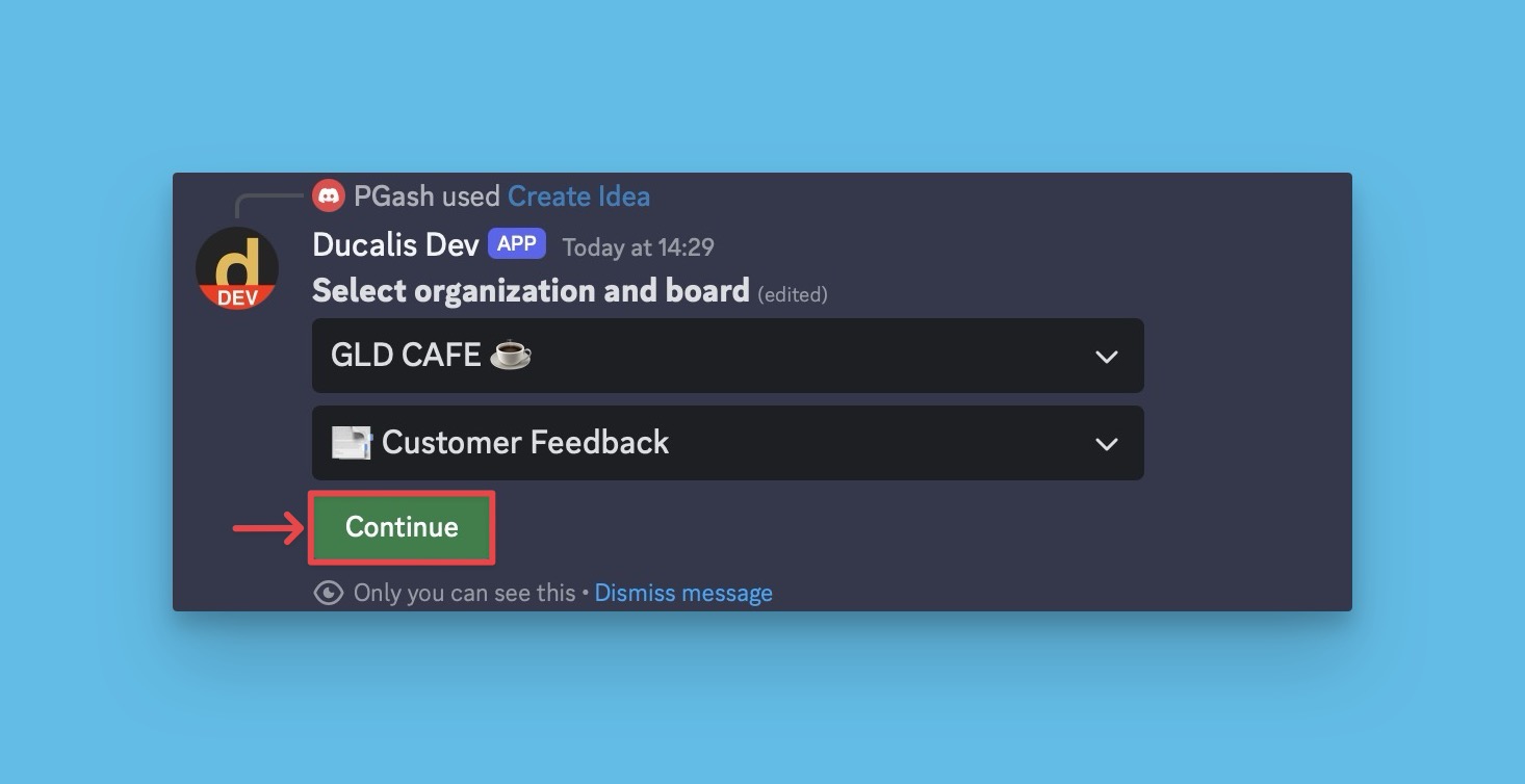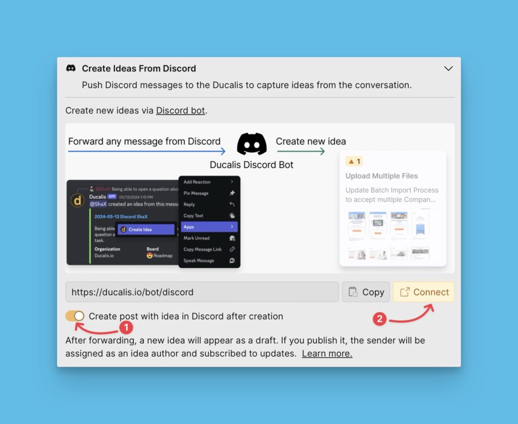 Ducalis ermöglicht es dir, Nachrichten in den Produktfeedback-Kanälen deines Discord-Servers in öffentliche Ideen für dein Voting Board umzuwandeln.