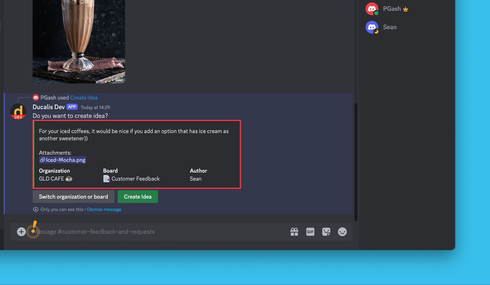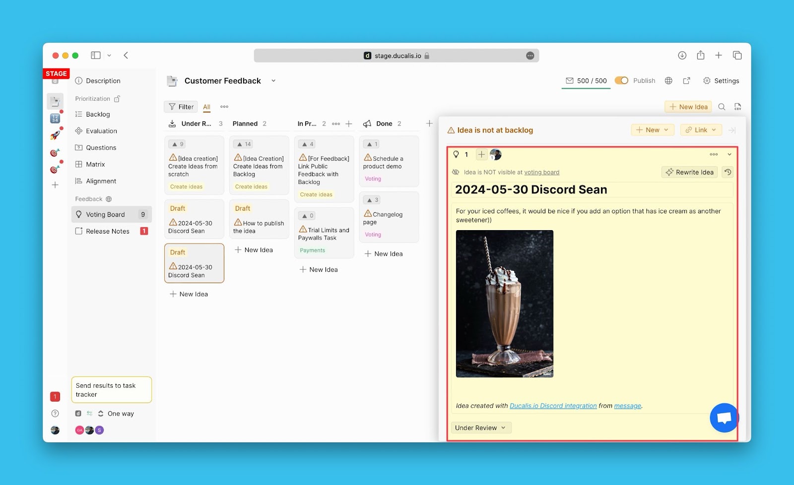 Du kannst auch Ideen aus Sprachnachrichten erfassen, die in Discord gesendet wurden. Siehe Ideen aus Sprachnachrichten erstellen, um zu erfahren, wie du gesprochenes Feedback mithilfe von AI in formatierte Ideen umwandeln kannst.