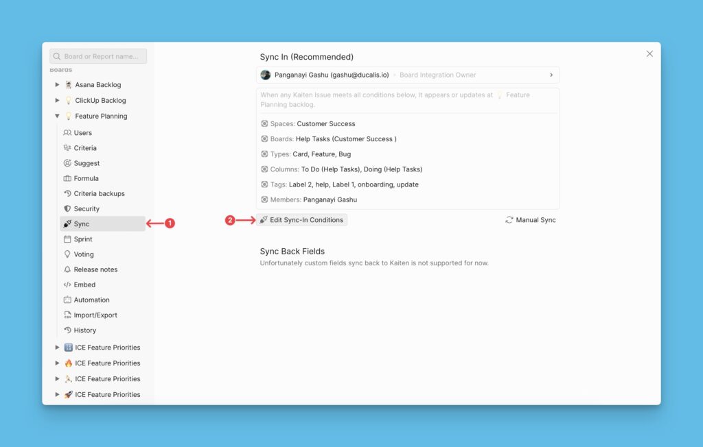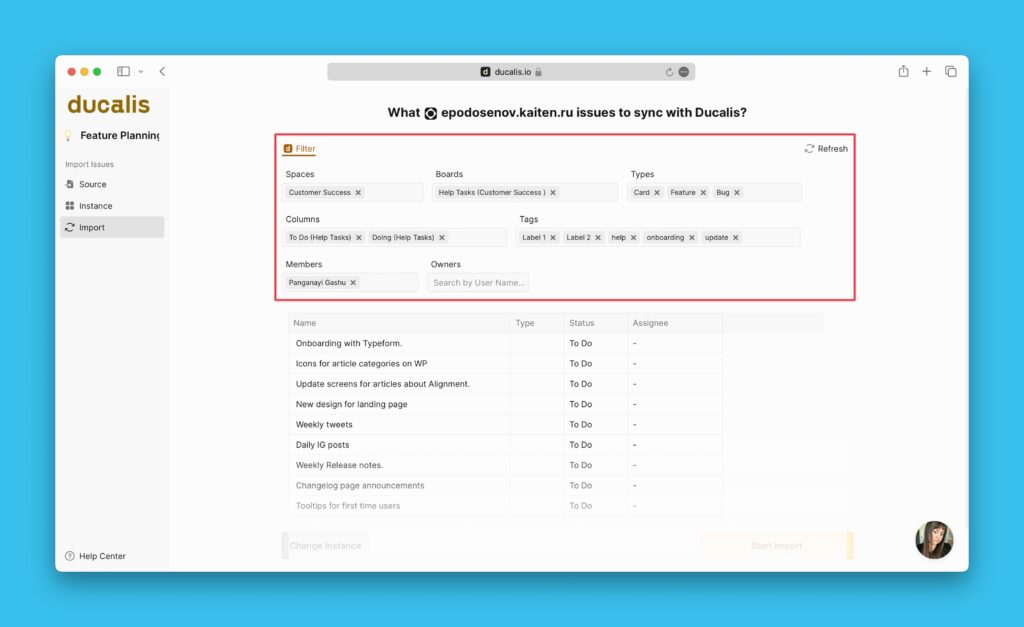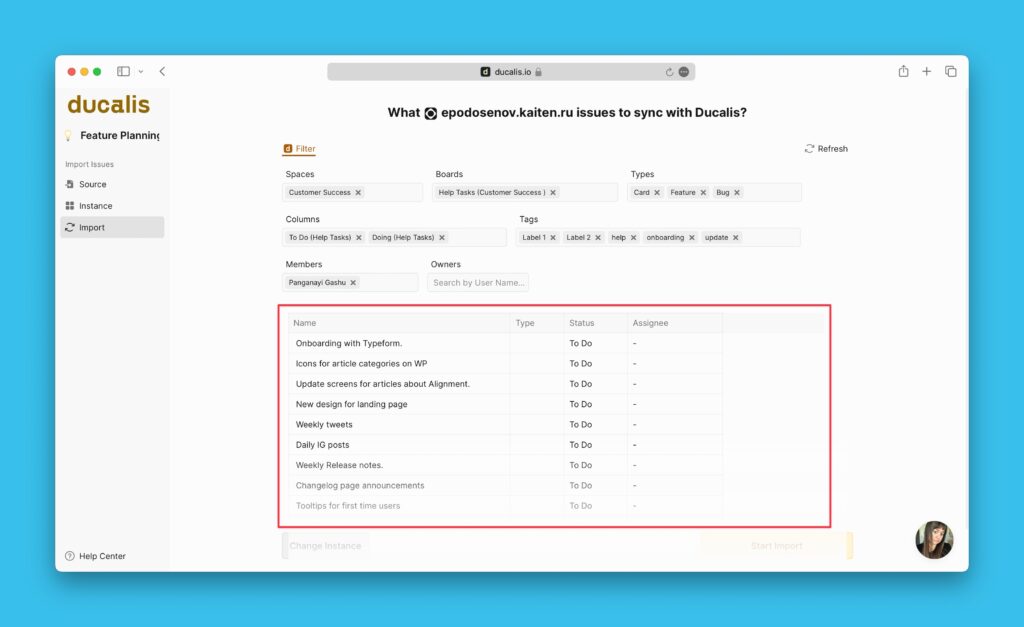 Nachdem du Kaiten erfolgreich mit Ducalis integriert hast, kannst du Issues aus Kaiten importieren.