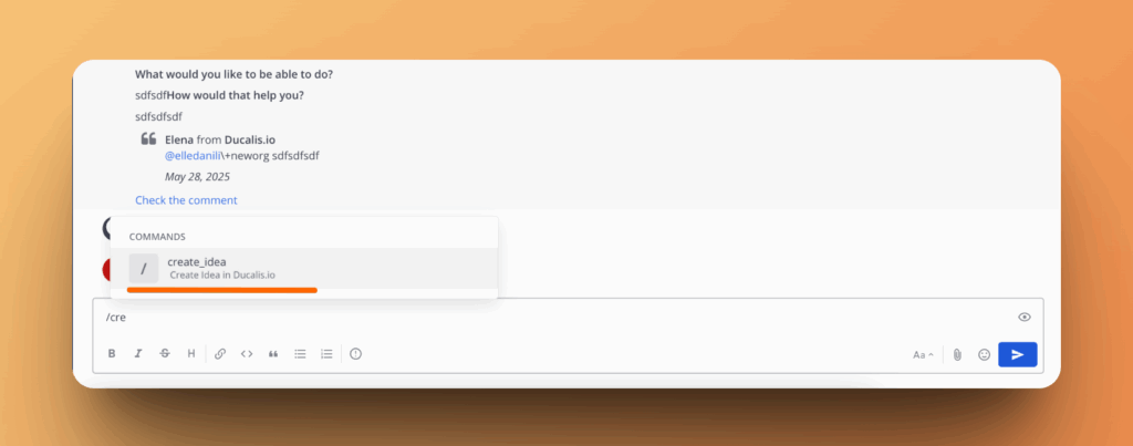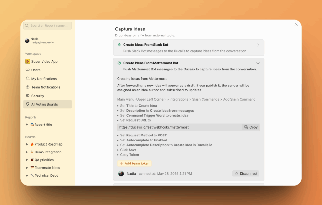 Wenn du Produkt-Feedback-Kanäle in deinem Mattermost-Account hast, kannst du das Feedback in öffentliche Ideen für dein Voting Board umwandeln. Die Integration von Ducalis mit Mattermost ermöglicht es dir, eine öffentliche Idee aus einem Mattermost-Kanal zu erstellen.