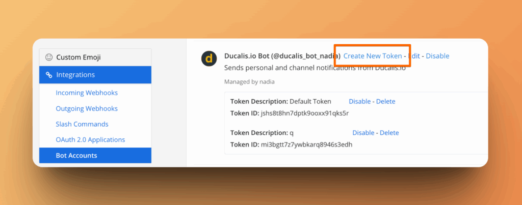 - Gehe zu Main Menu (Hauptmenü) (obere linke Ecke) > Integrations > Bot Accounts (Integrationen > Bot-Konten) > Wähle den zuvor erstellten Bot > klicke auf Create New Token (Neuen Token erstellen).