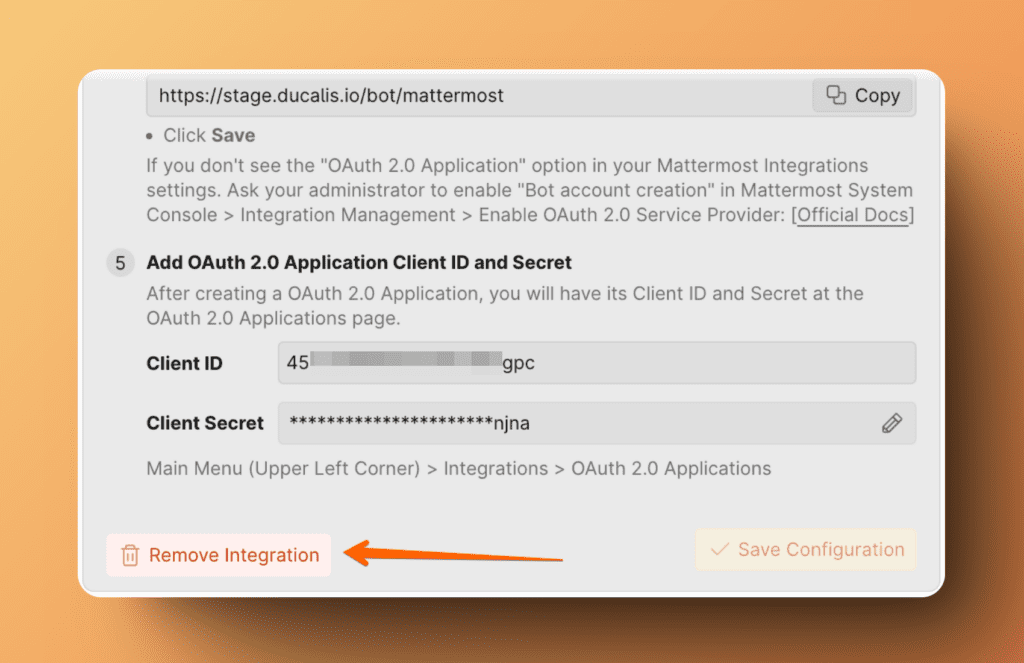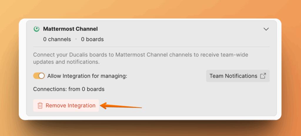 Finde Mattermost Channel. Klicke auf Remove Integration (Integration entfernen).
