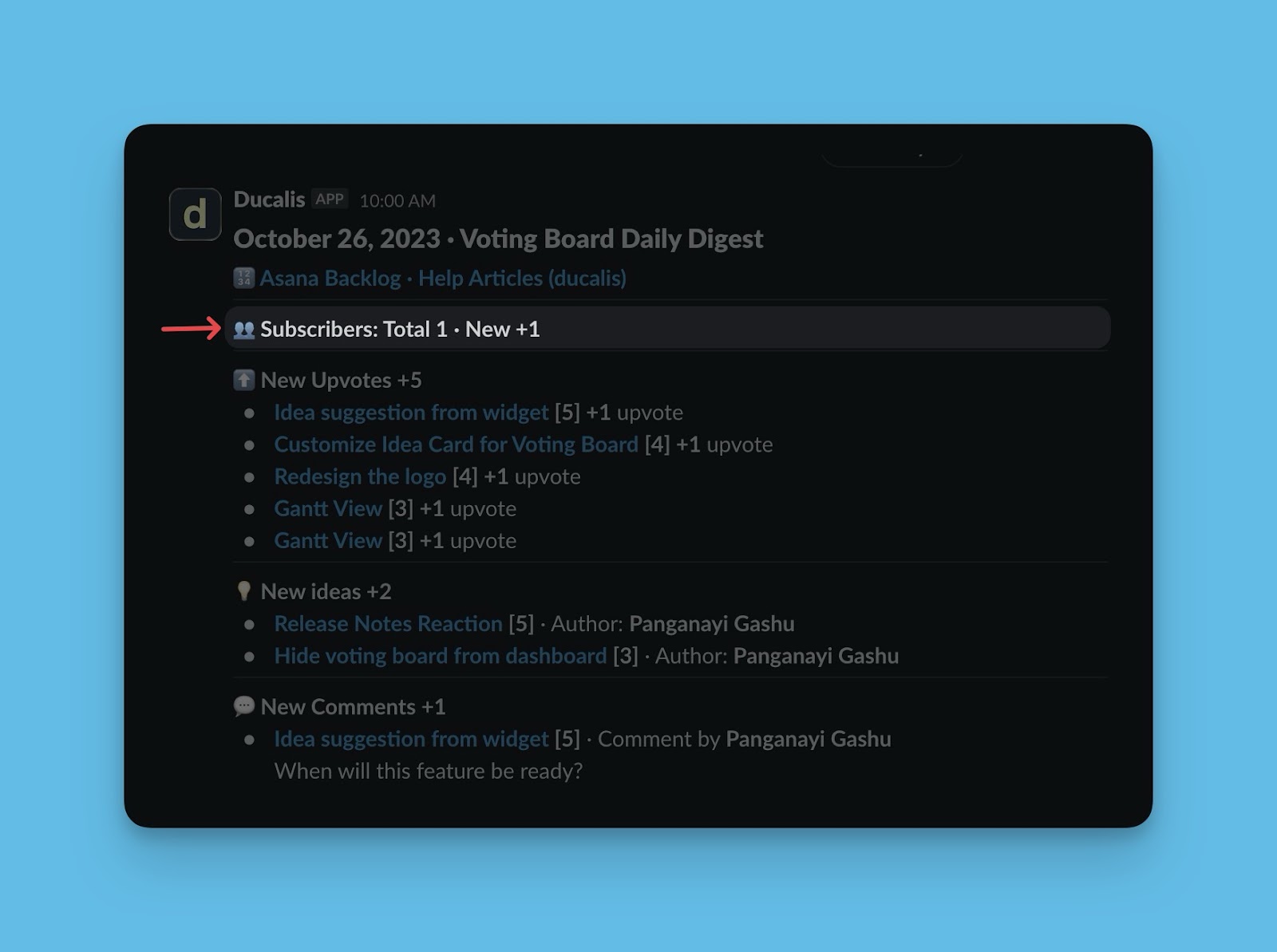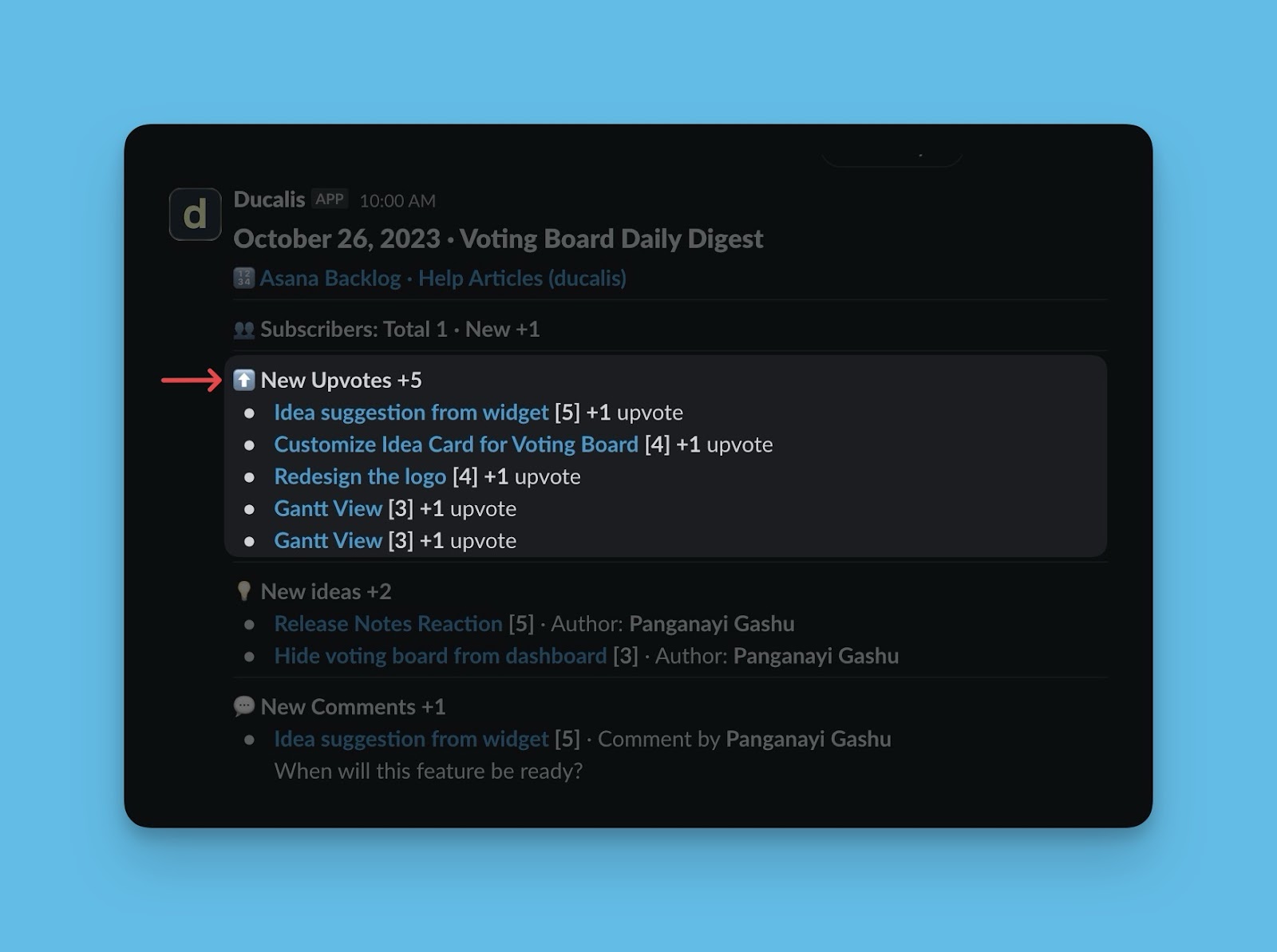 Anstatt Benachrichtigungen über jede einzelne Aktivität auf dem Voting Board zu erhalten, kannst du über den Slack Digest eine Zusammenfassung aller Ereignisse eines Tages erhalten.