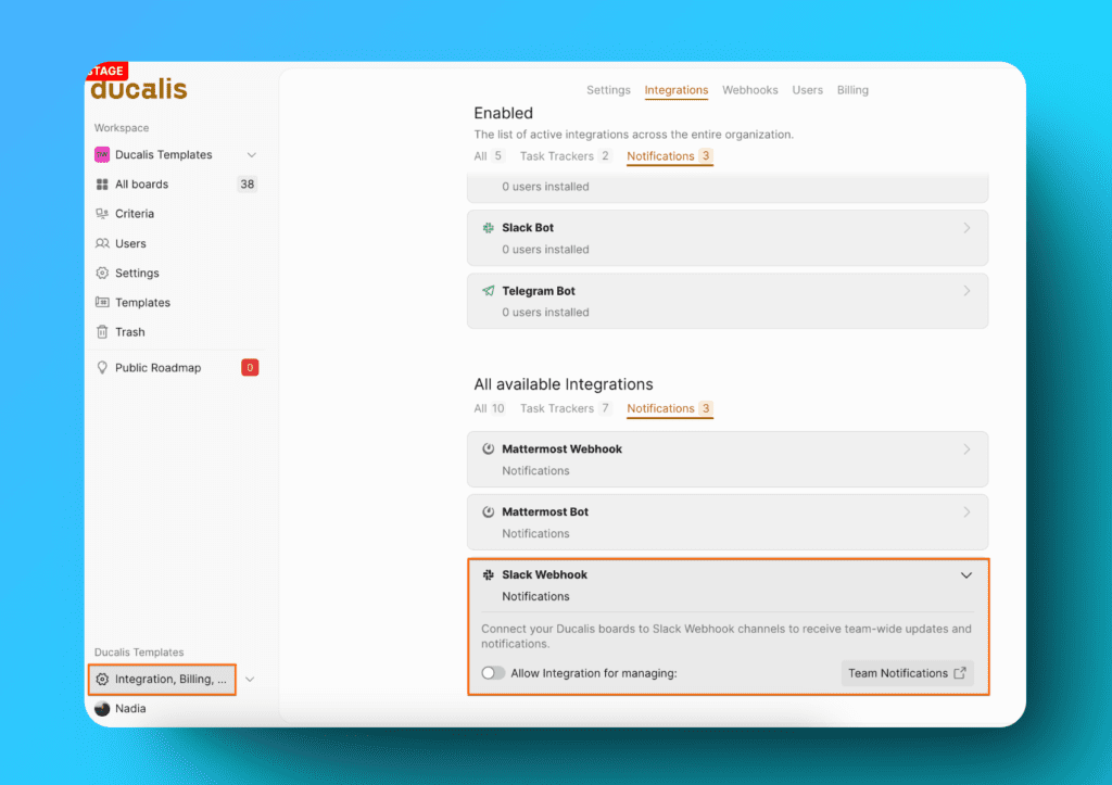 - Gehe zu Integrations (Integrationen) > Slack Webhook.