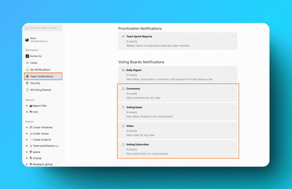 Um die zusätzlichen Benachrichtigungen einzurichten, gehe zu Team Notifications (Teambenachrichtigungen) > Voting Boards Notifications (Voting-Board-Benachrichtigungen).
