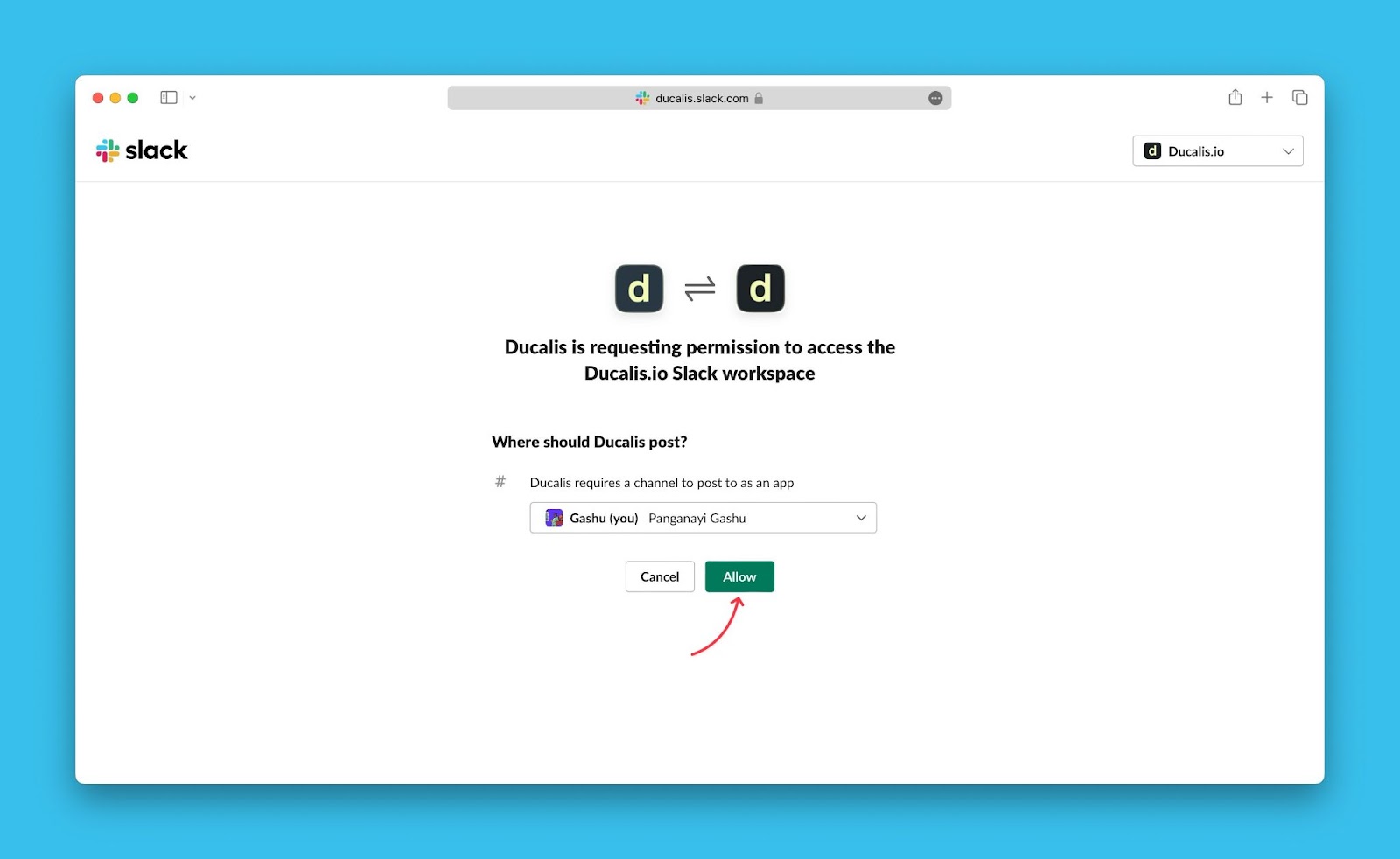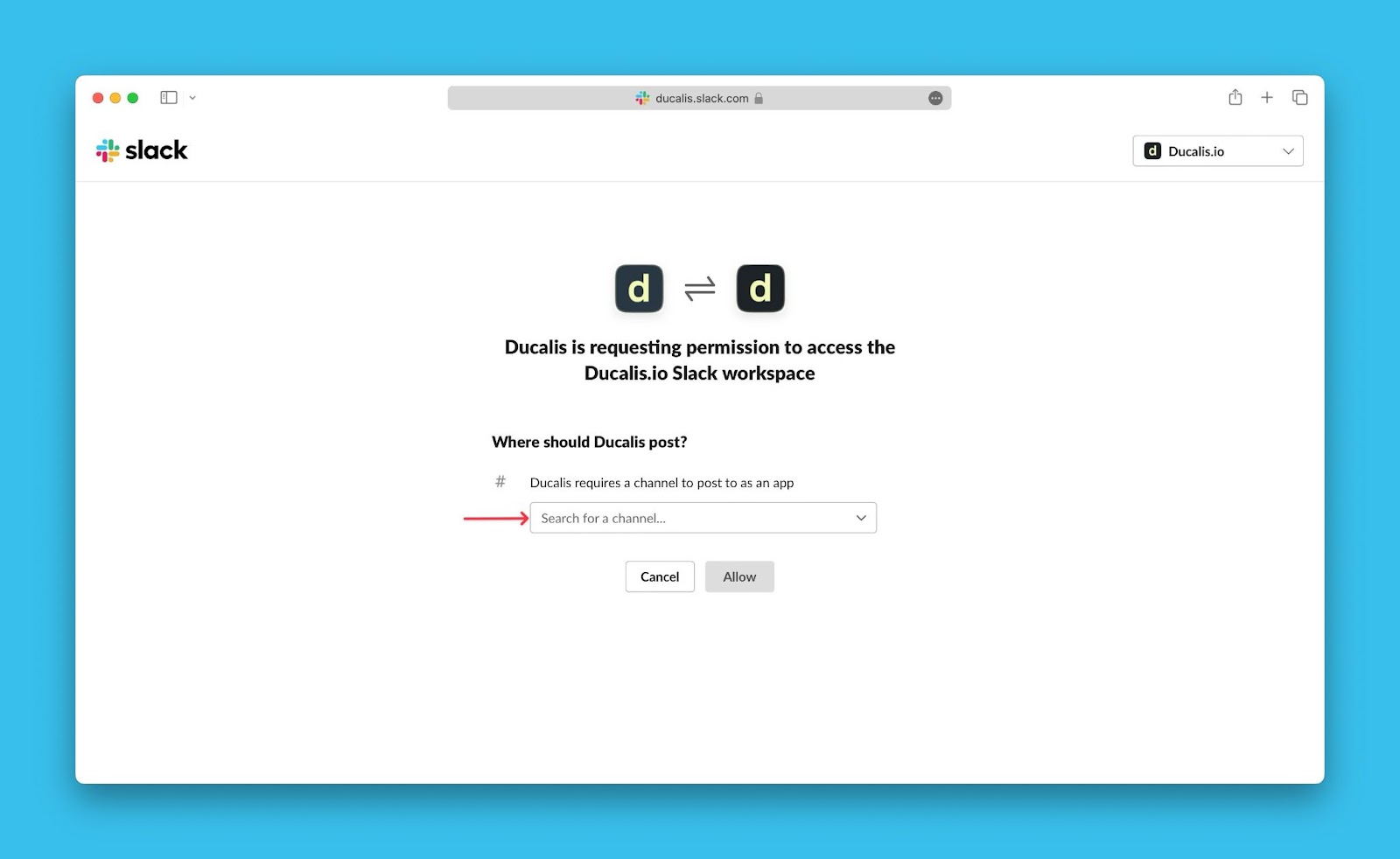 - Erteile Ducalis Zugriff auf den Slack-Kanal, an den der Digest gesendet werden soll.