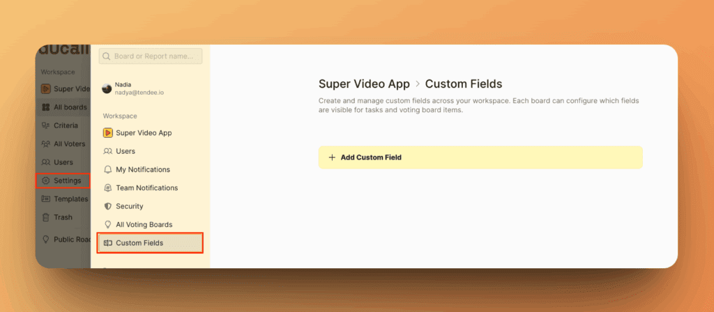 Um auf deine benutzerdefinierten Felder zuzugreifen und diese zu verwalten, navigiere zu Einstellungen > Benutzerdefinierte Felder.