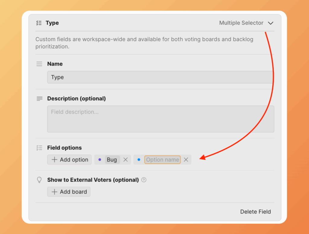 Beim Erstellen von Feldern mit Select (Auswahl) kannst du Optionen hinzufügen — diese werden Feldoptionen genannt.