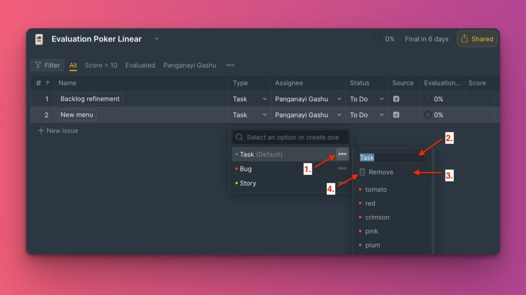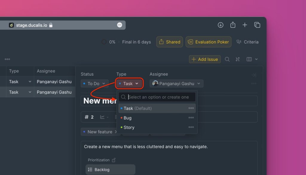 Standardmäßig ist der Vorgangstyp, den du findest, wenn du ein neues Board/einen neuen Vorgang erstellst, "Task" (Aufgabe). Du kannst ihn löschen oder bearbeiten: