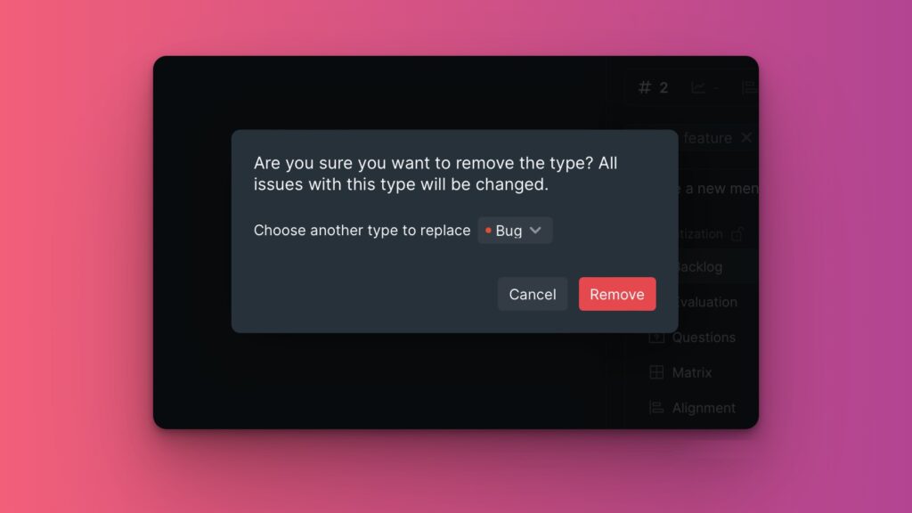 - Wenn du dich entscheidest, einen Vorgangstyp zu entfernen, der einigen Vorgängen zugewiesen ist, werden wir dich bitten, einen anderen vorhandenen Vorgangstyp auszuwählen, um deine Vorgänge mit dem Vorgangstyp zuzuweisen, den du entfernen möchtest.