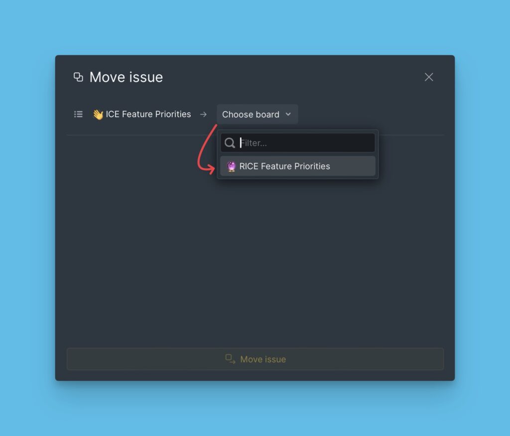 1. Wähle aus der Dropdown-Liste Move issue to another board (Vorgang in ein anderes Board verschieben). Oder verwende die Tastenkombination M.