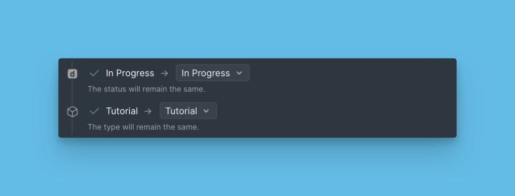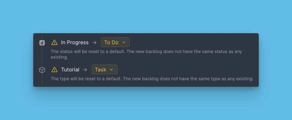 Wenn ein Status oder Typ mit demselben Namen im Ziel-Board nicht verfügbar ist, erhält der Vorgang den Standard-Status oder -Typ im Ziel-Board.