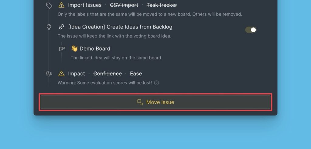 Beim Verschieben eines Vorgangs in ein anderes Board hast du die Möglichkeit, die Verbindung mit der verknüpften öffentlichen Idee beizubehalten oder sie zu trennen.
