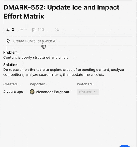 - Go to Backlog, choose the issue, and click Create Public Idea with AI.