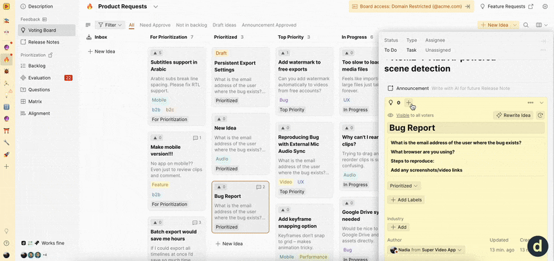 Voting Boards are containers for ideas, and each idea can receive comments and votes from users (internal and external).