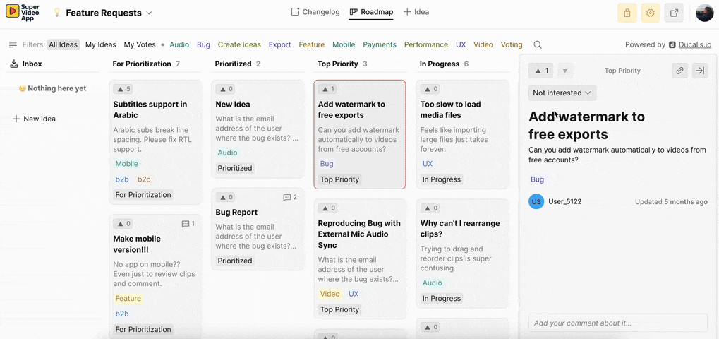 When you update an idea's status, it automatically moves along the roadmap, showing users that you're actively working on their requests. Learn more.