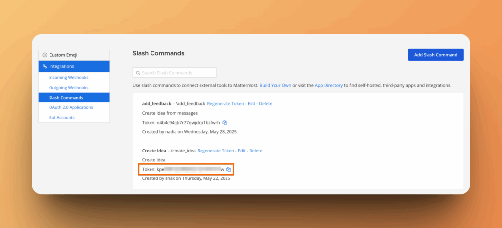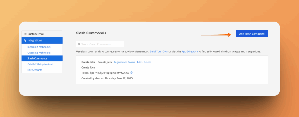6. Mattermost からアイデアを作成するには、スラッシュコマンドを設定する必要があります。