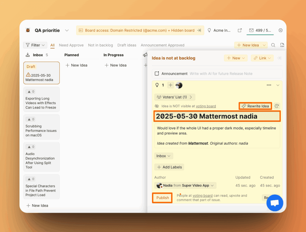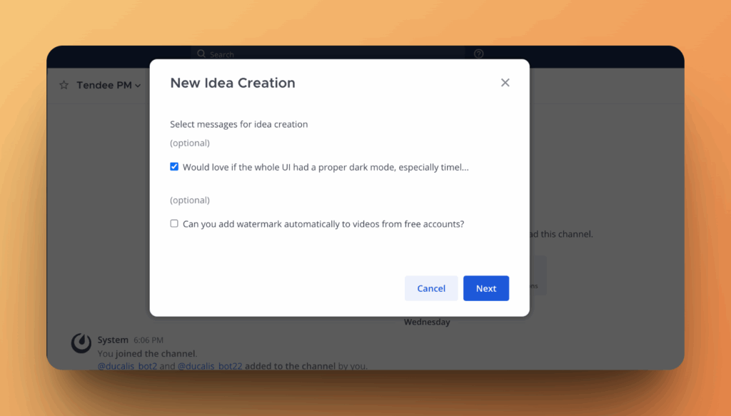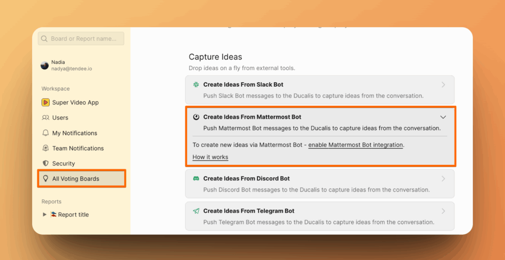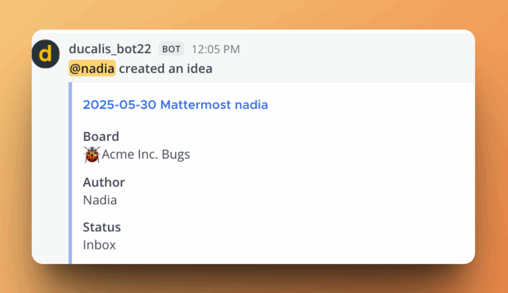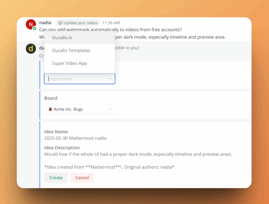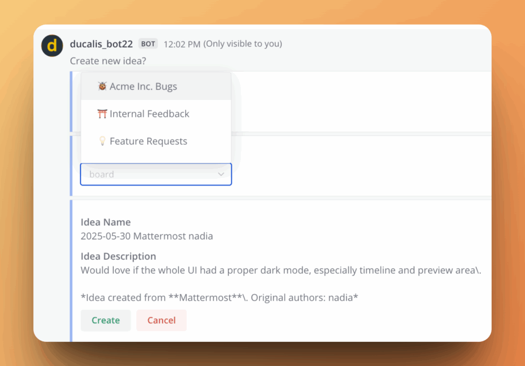 Mattermost アカウントにプロダクトフィードバック用のチャンネルがある場合、フィードバックを投票ボードのパブリックアイデアに変換できます。Ducalis と Mattermost の連携により、Mattermost チャンネルからパブリックアイデアを作成できるようになります。