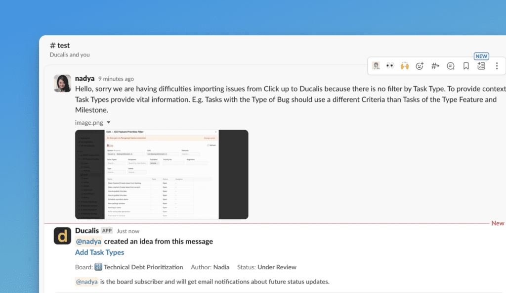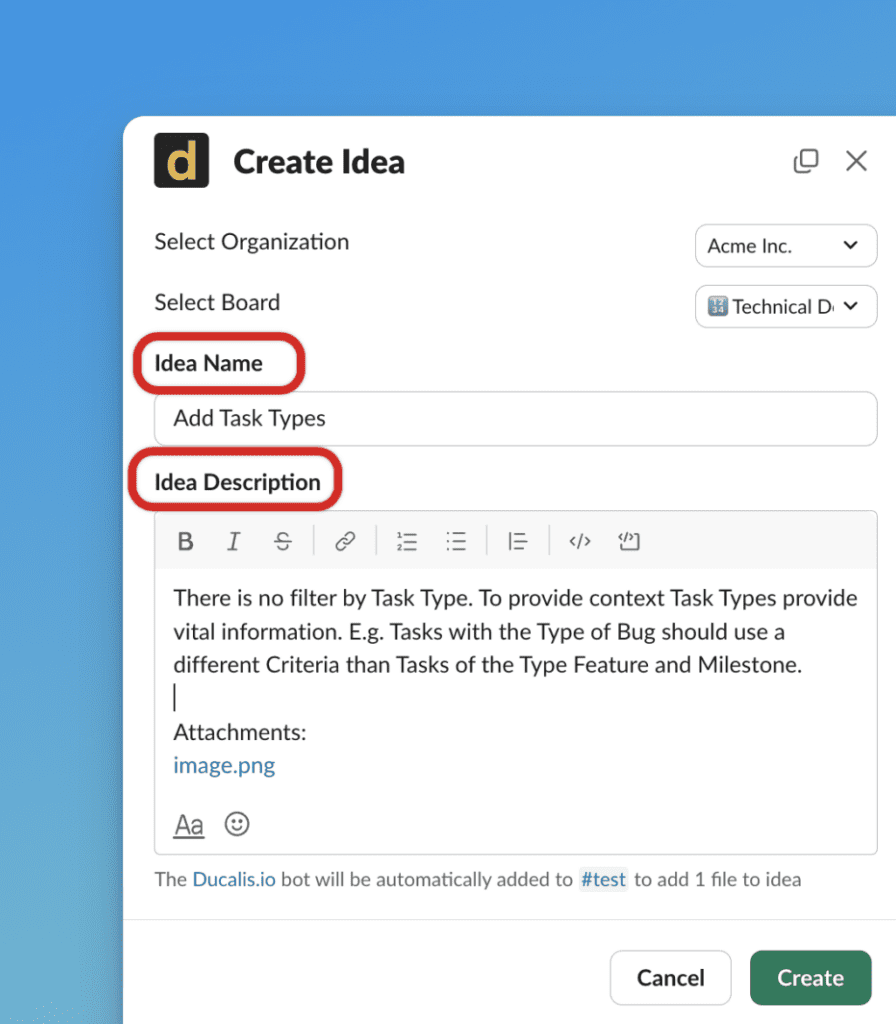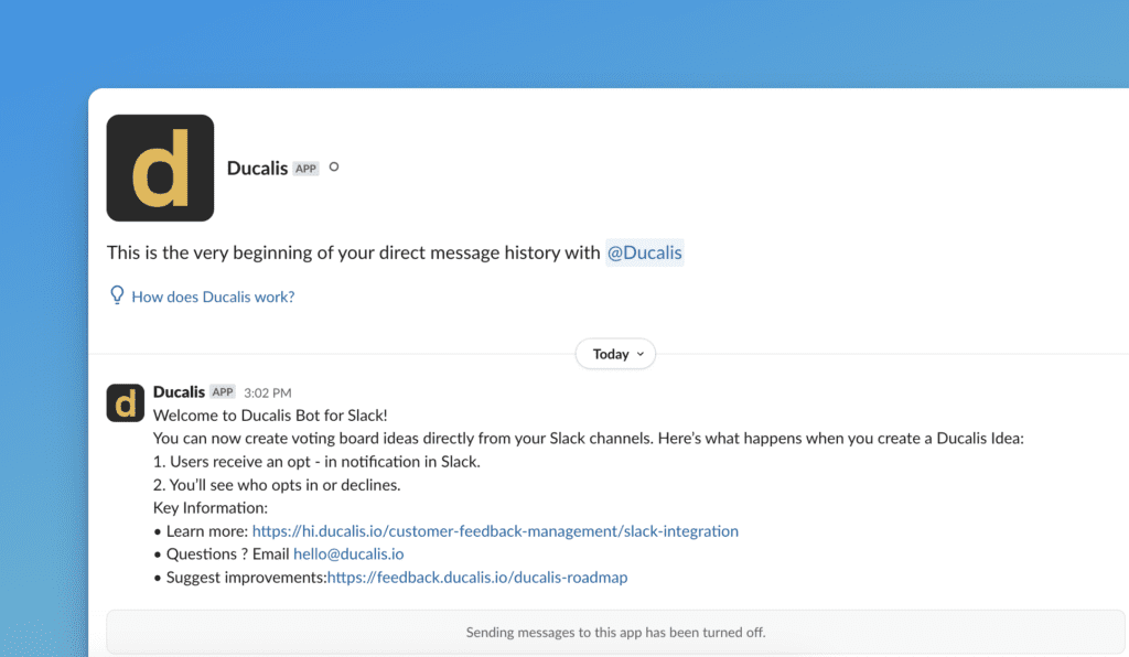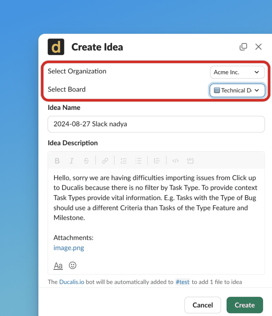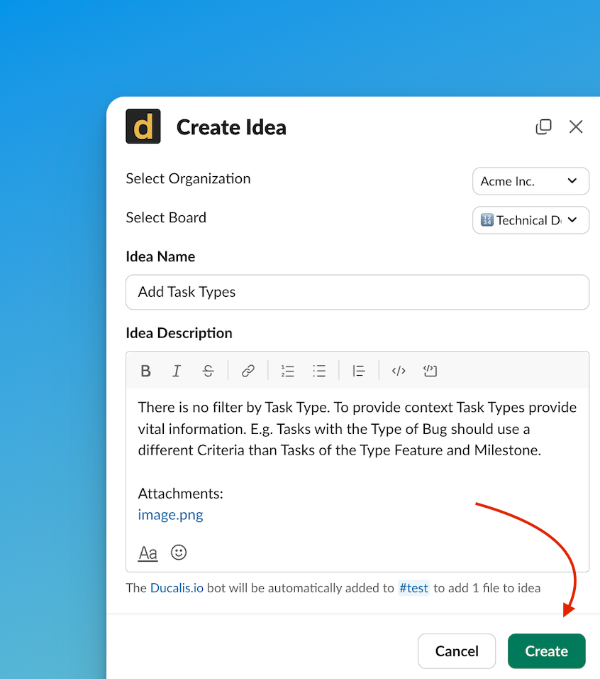 Slack アカウントに製品フィードバック用のチャンネルがある場合、そのフィードバックを投票ボードの公開アイデアに変換できます。Ducalis と Slack の連携により、Slack チャンネルから公開アイデアを作成できます。