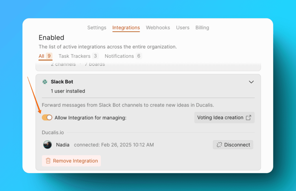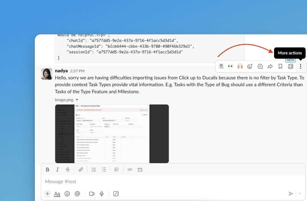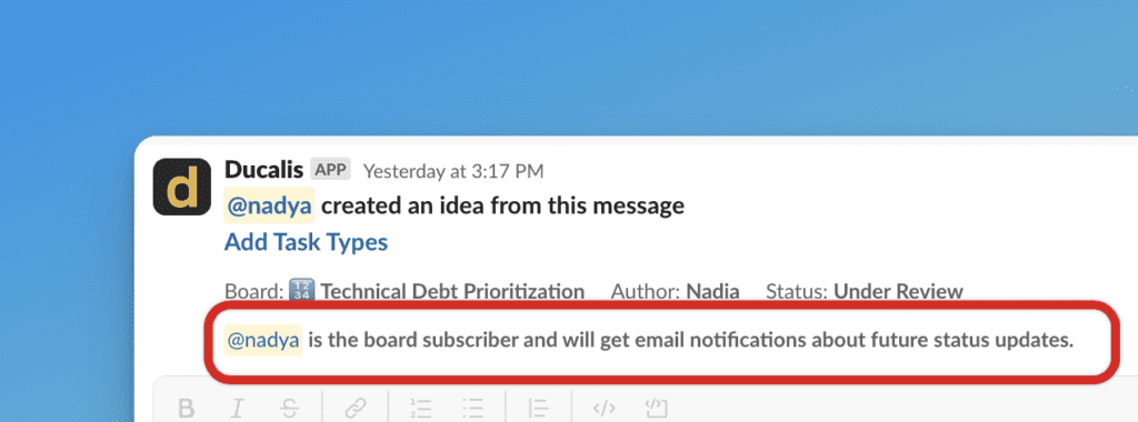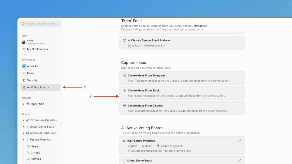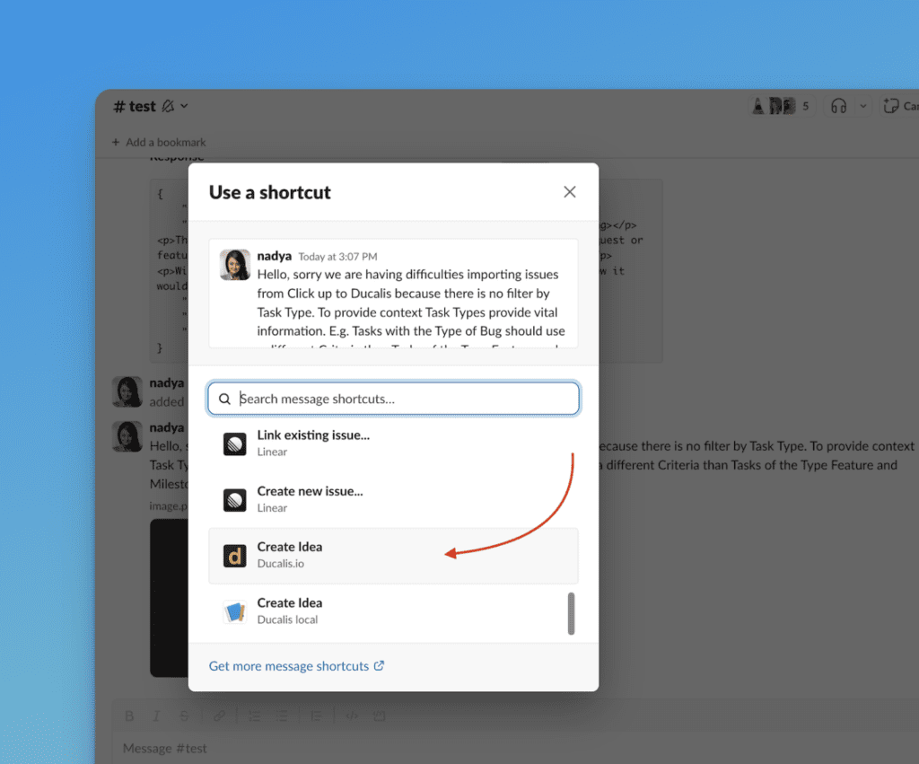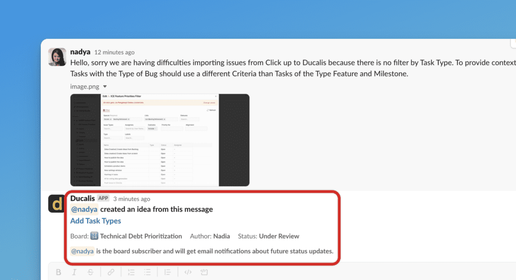 Slack アカウントに製品フィードバック用のチャンネルがある場合、そのフィードバックを投票ボードの公開アイデアに変換できます。Ducalis と Slack の連携により、Slack チャンネルから公開アイデアを作成できます。