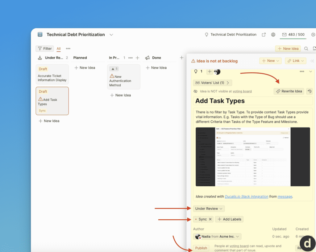 - アイデアは下書きとして投票ボードに追加されます。公開前にアイデアをさらに編集できます - ラベルを追加したり、Ducalis AI を使用して書き直したりできます。