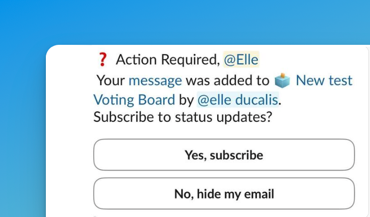 - アイデアの作成者が管理者でも投票ボードの購読者でもない場合、購読してメールアドレスを購読者リストと共有するかどうかを尋ねる Slack メッセージが届きます。