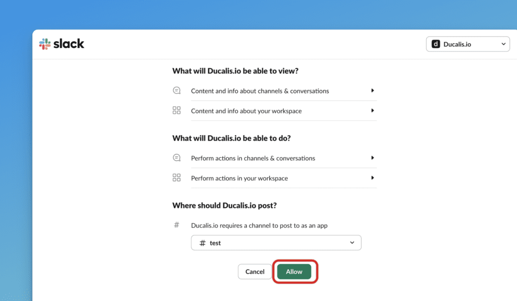 - Allow (許可)をクリックして、Ducalis に Slack ワークスペースへのアクセスを認証します。