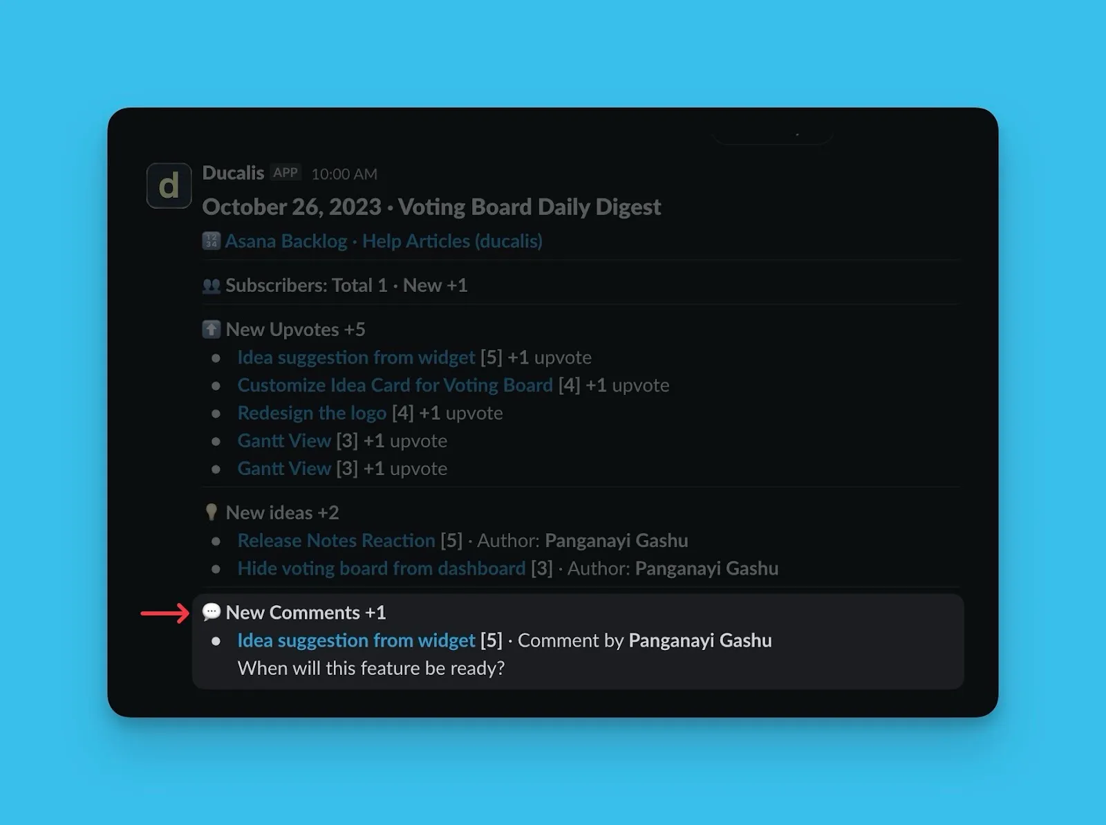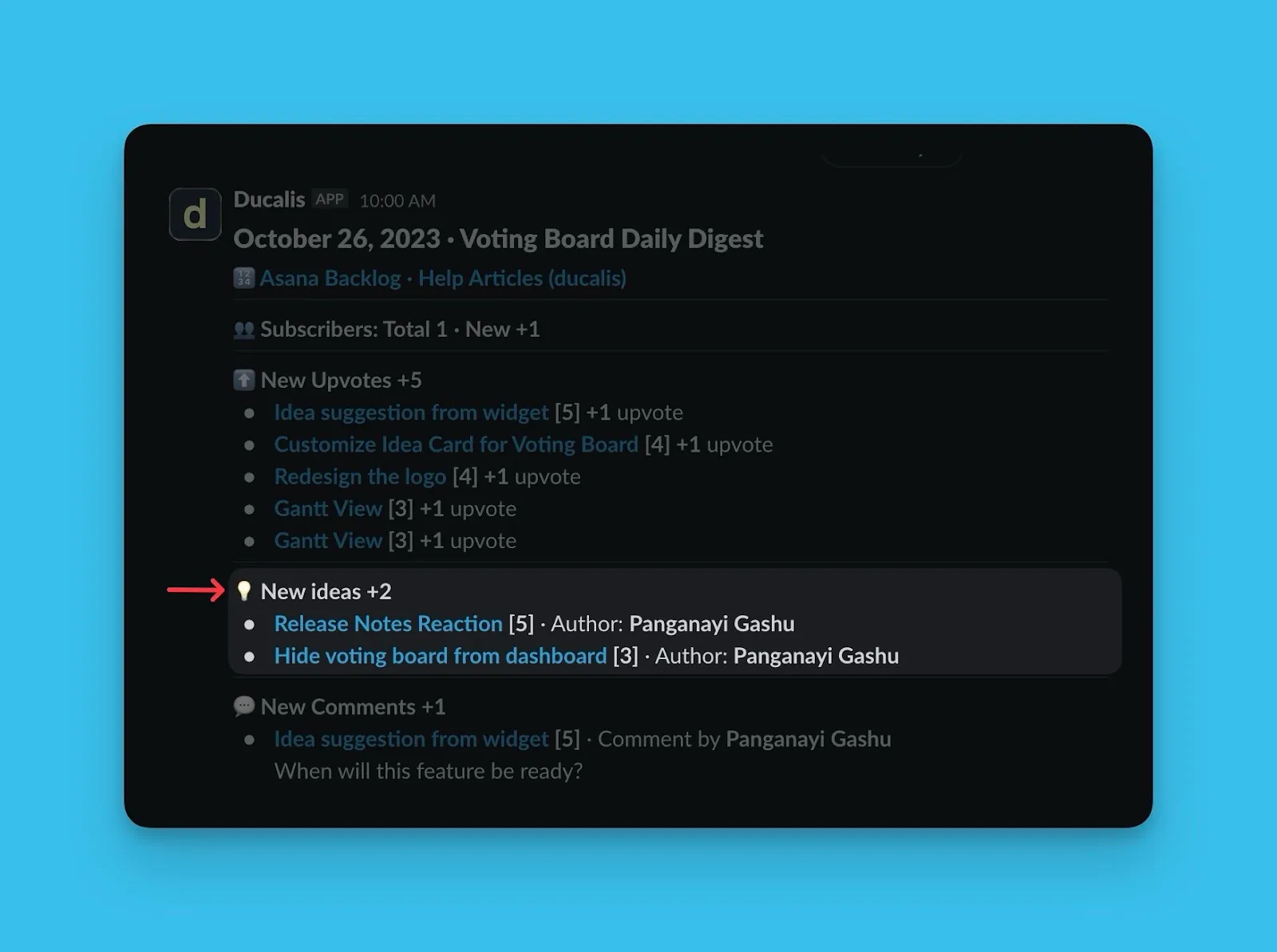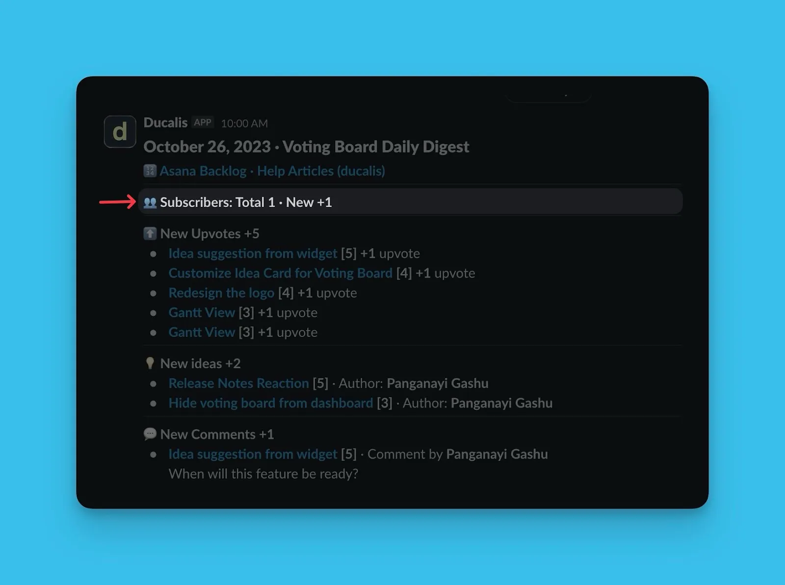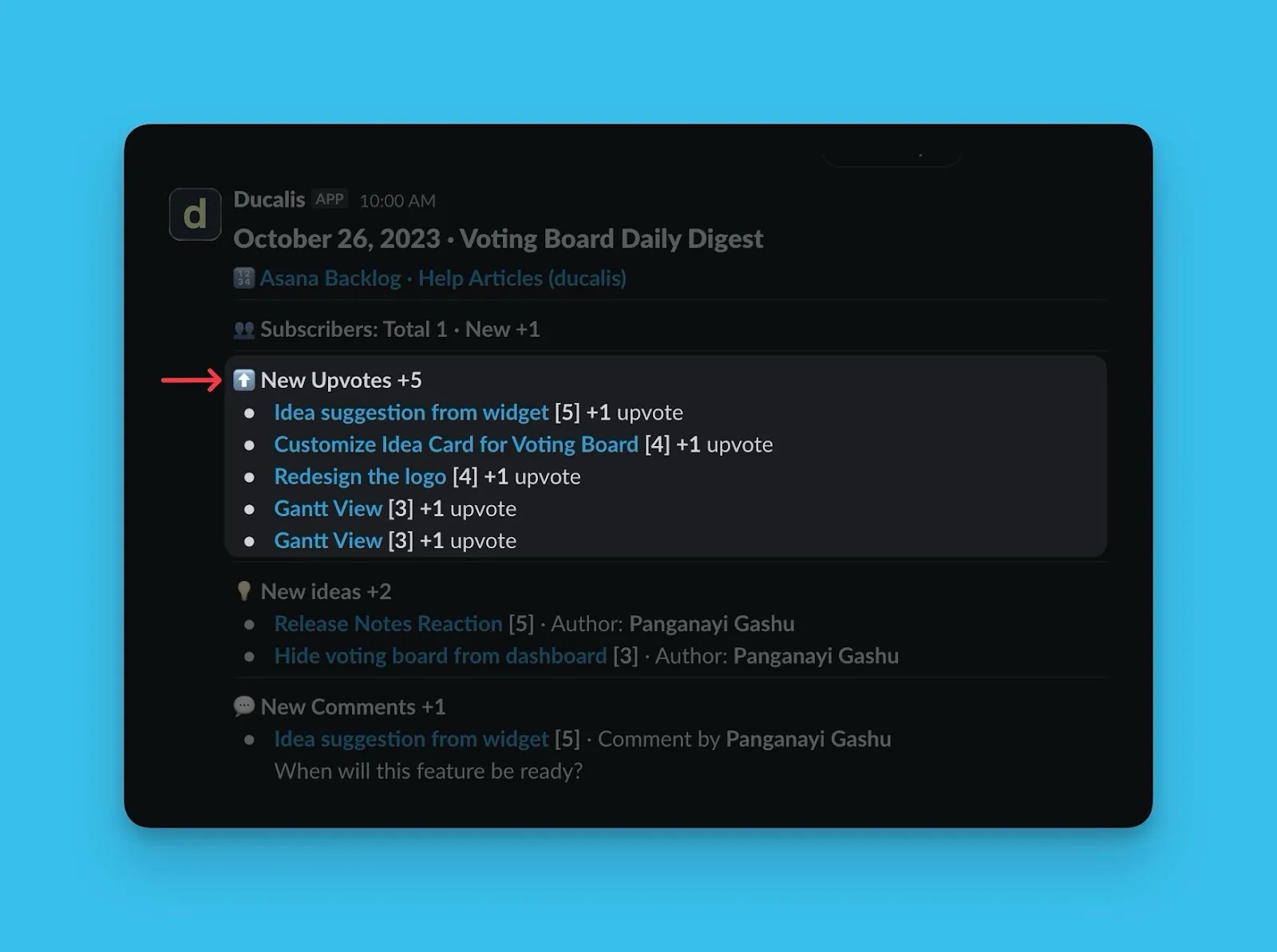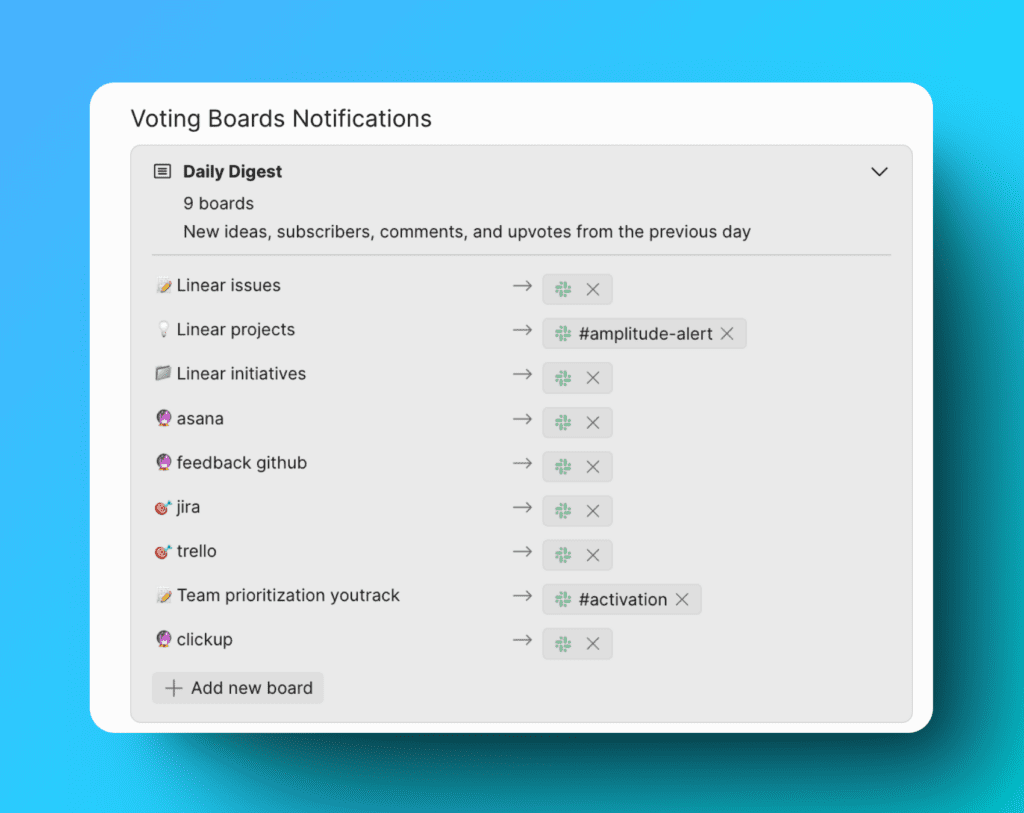 投票ボードで発生する個々のアクティビティの通知を受け取る代わりに、1 日に発生したすべての内容のサマリーを Slack ダイジェストとして Slack チャンネルに送信できます。