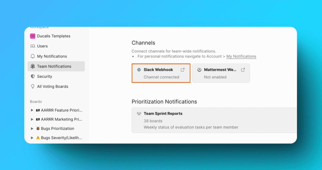 追加の通知を設定するには、Team Notifications > Voting Boards Notifications (チーム通知 > 投票ボード通知) に移動します。