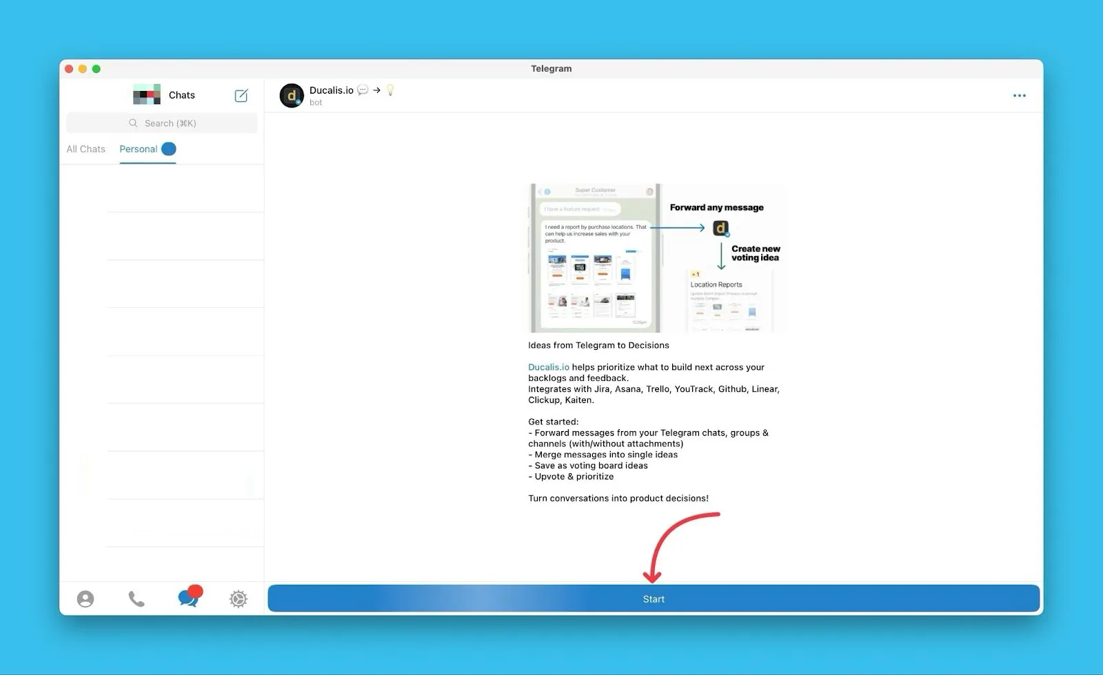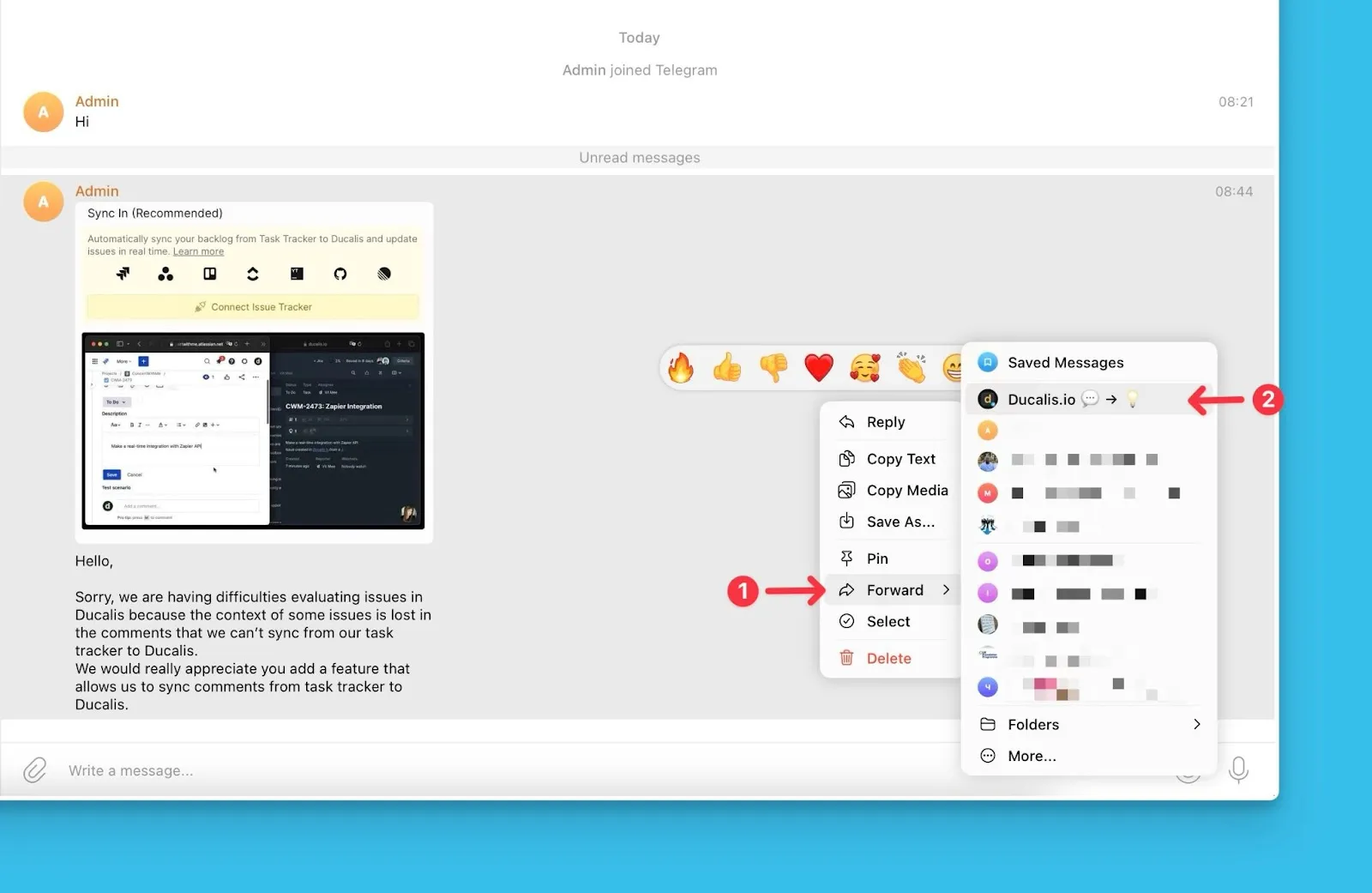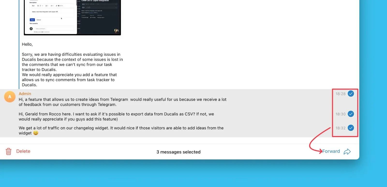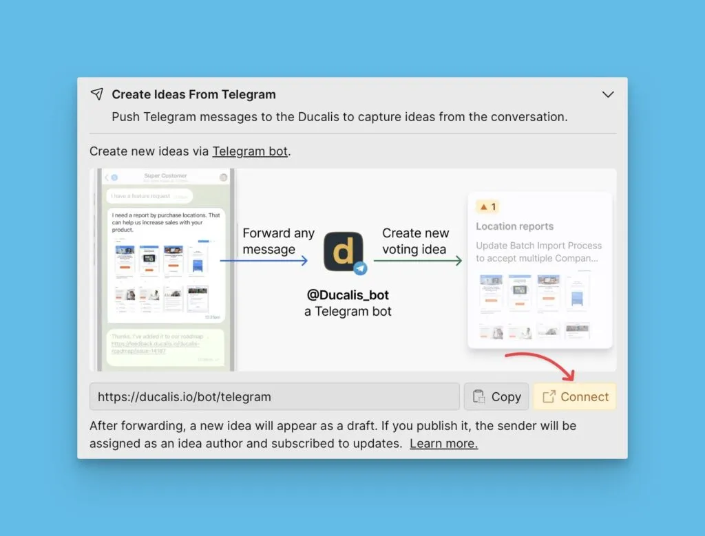 ユーザーが Telegram から Ducalis Telegram ボットにメッセージを直接転送できるようにすることで、手動でのデータ入力が不要になり、貴重なフィードバックのキャプチャと実装のプロセスが効率化されます。