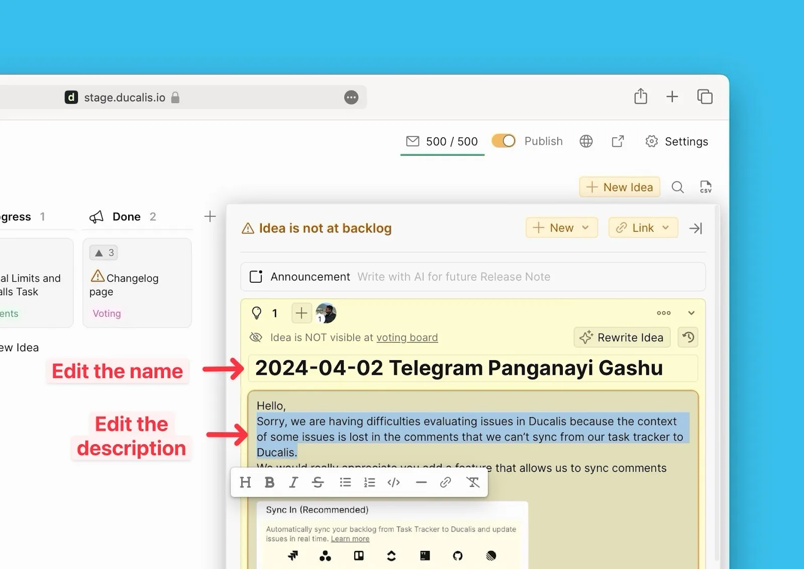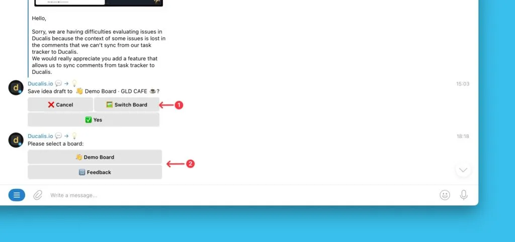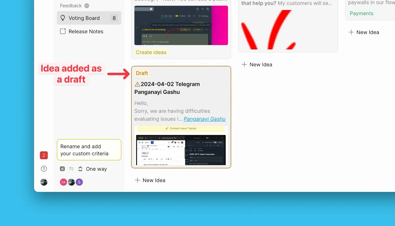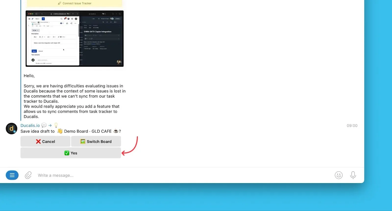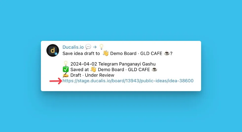 Telegram で受信した顧客からのフィードバックやリクエストを含むメッセージを、投票ボードのパブリックアイデアにシームレスに変換できます。