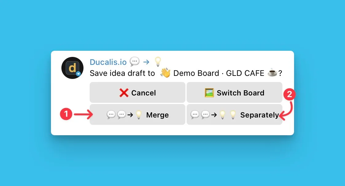 複数のメッセージを Ducalis Telegram ボットに転送する際、アイデアを一括作成することでプロセスを効率化できます。