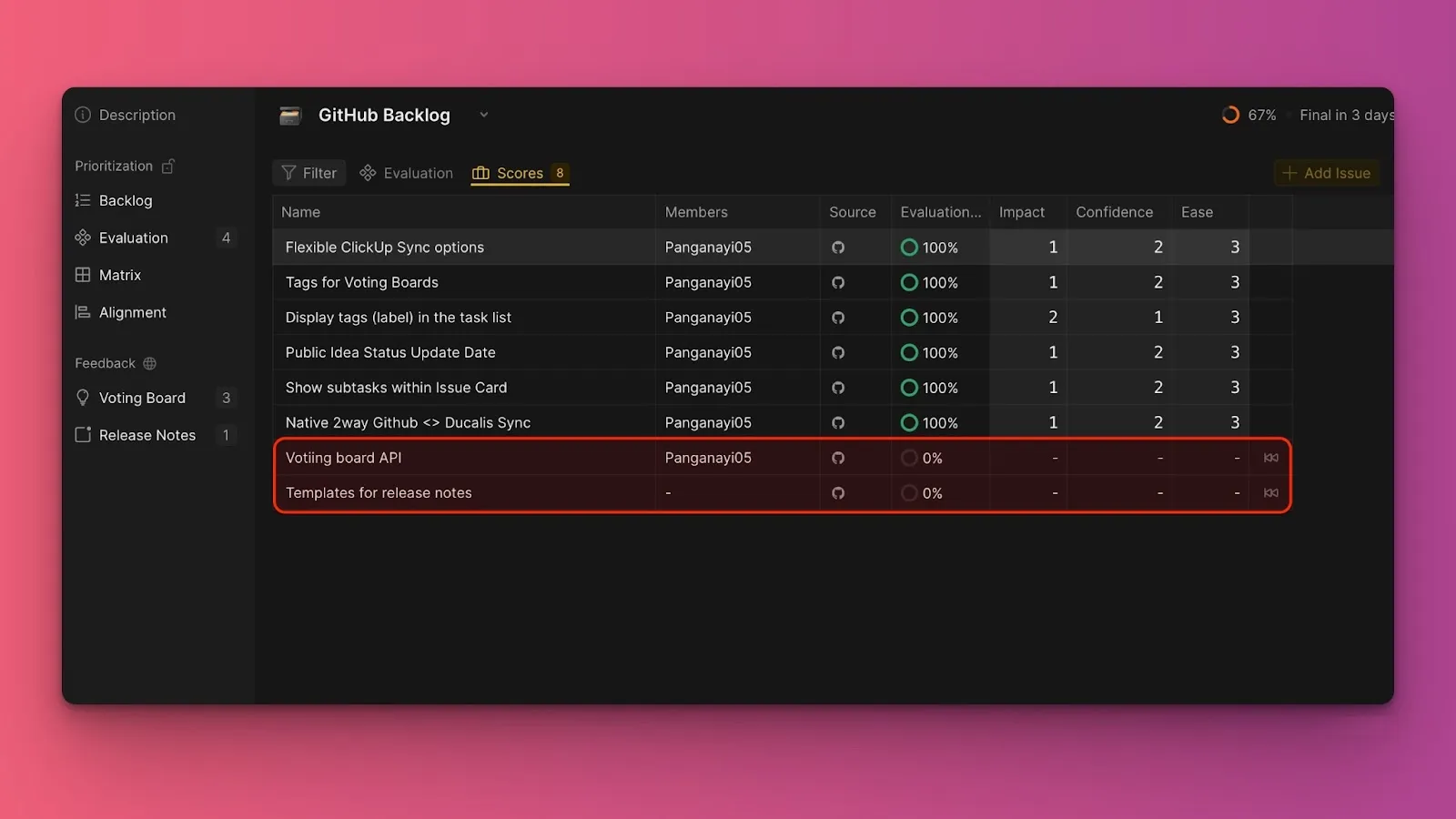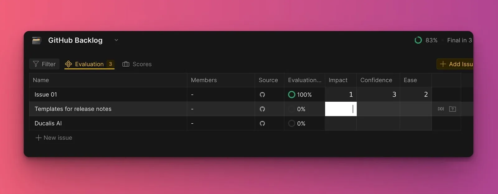 - Evaluation (評価) タブに移動して、優先順位付けのための課題の評価を開始します。