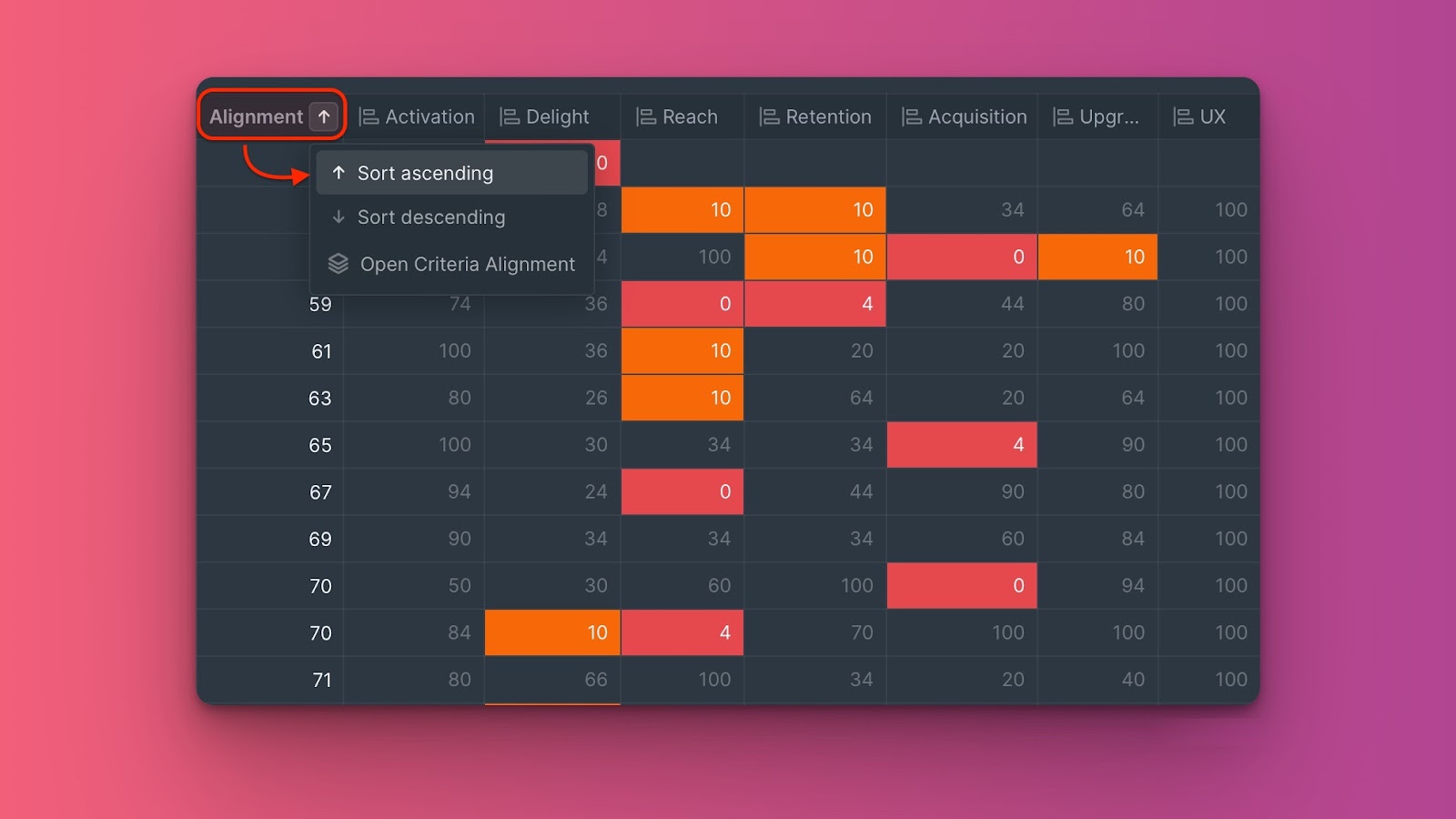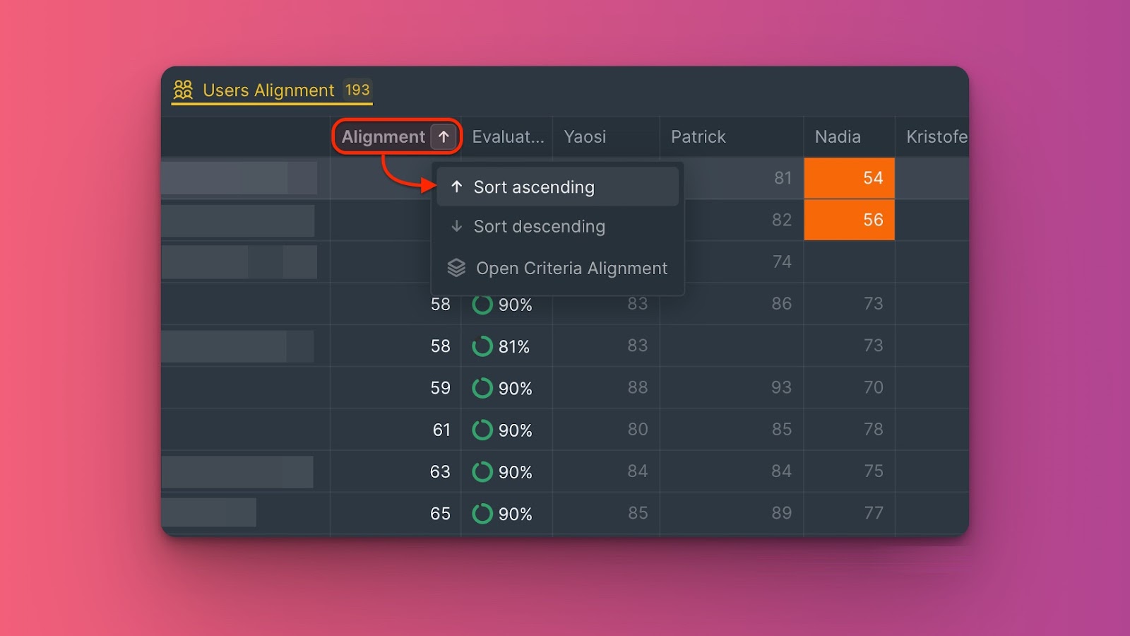 To quickly see the issues with the lowest alignment, you can sort the issues as ascending (the least aligned issue at the top).