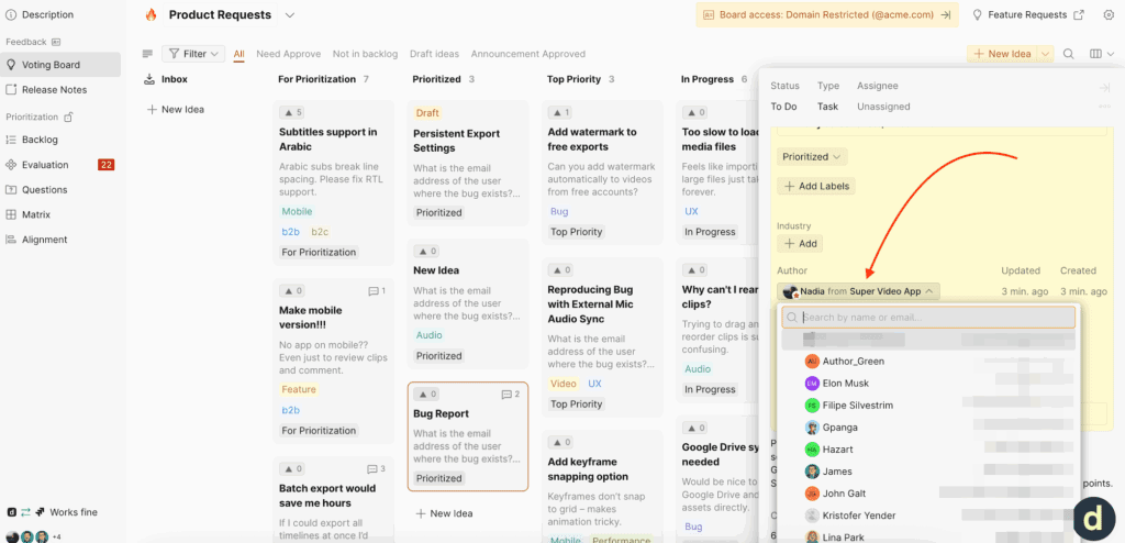 2. Every idea can be assigned an author. This way, there is accountability as to who is responsible for addressing specific feedback. Learn more.