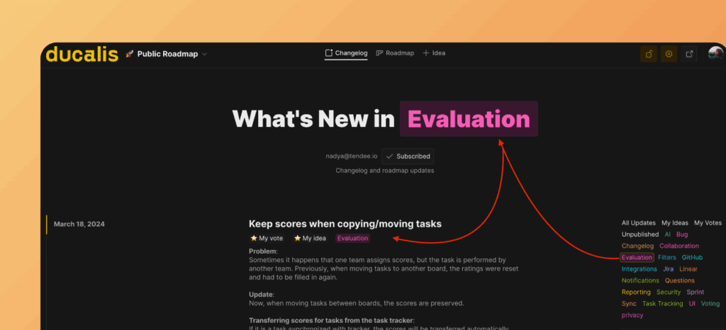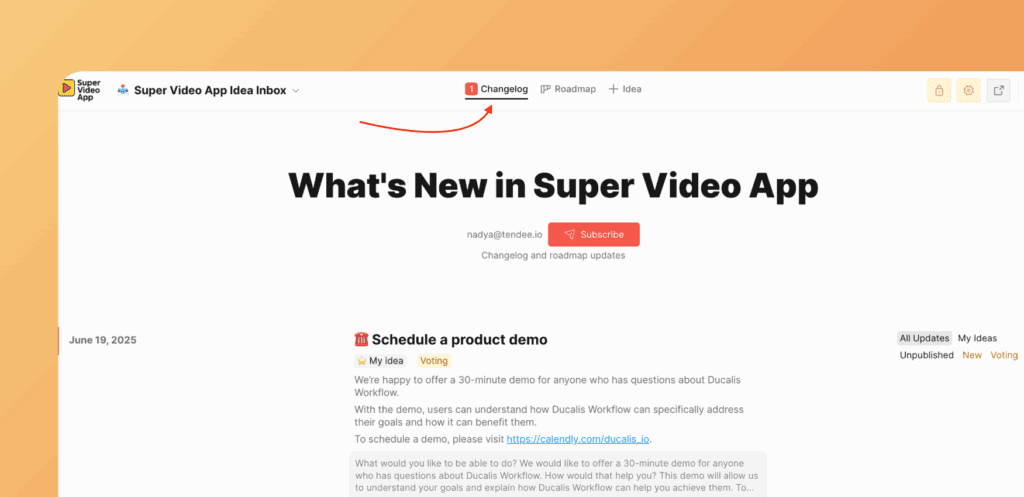 The Ducalis changelog is a great way for your team to officially announce product updates. Your users will be able to view all your release updates on a single, unified page!