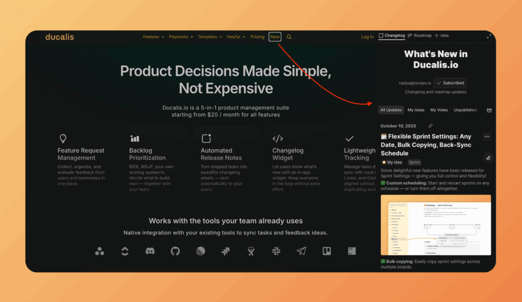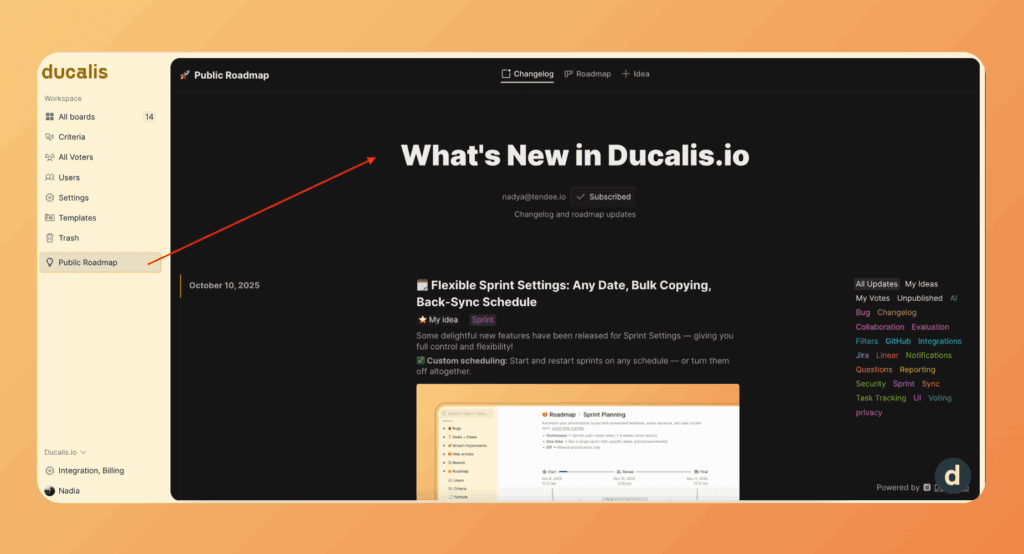 Embed a changelog directly into your product, just like you see in Ducalis: