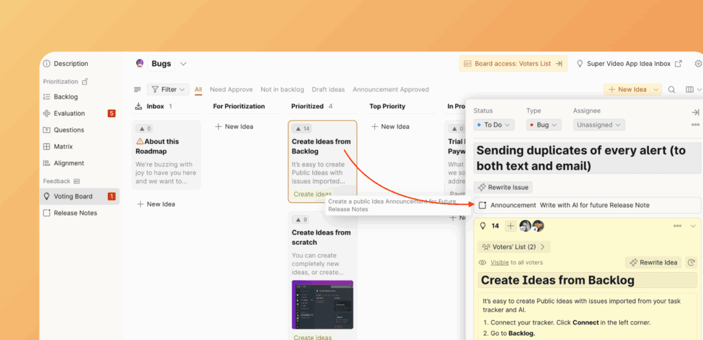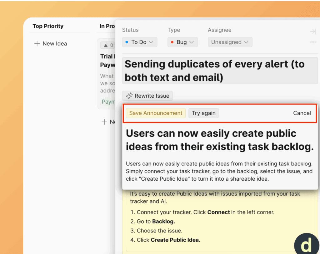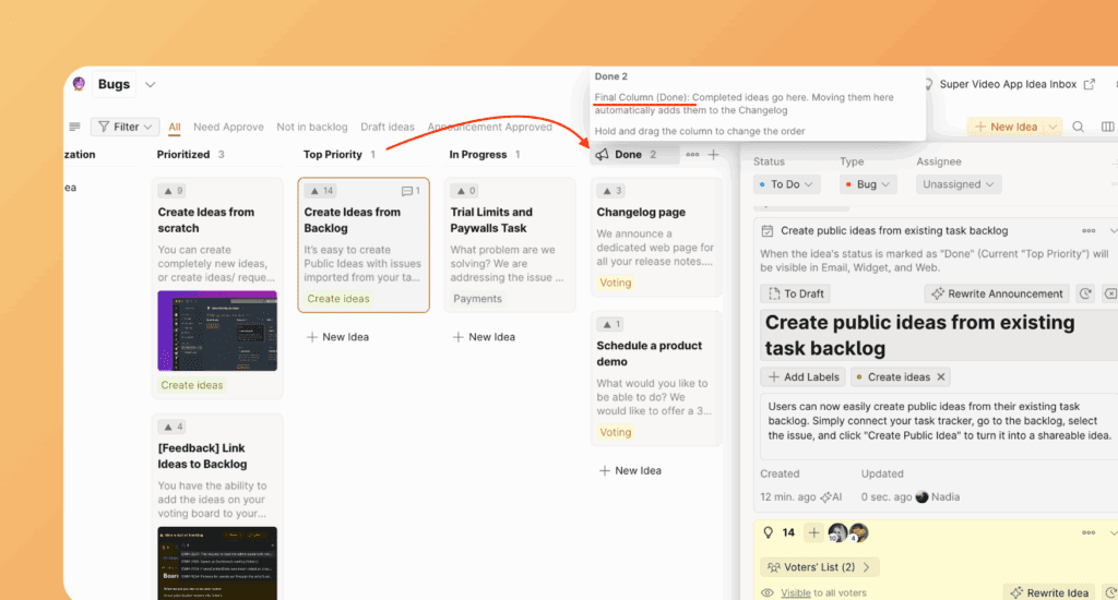 When you move an idea to the Done status (note that it must be the final column), the announcement will appear on the Changelog page.