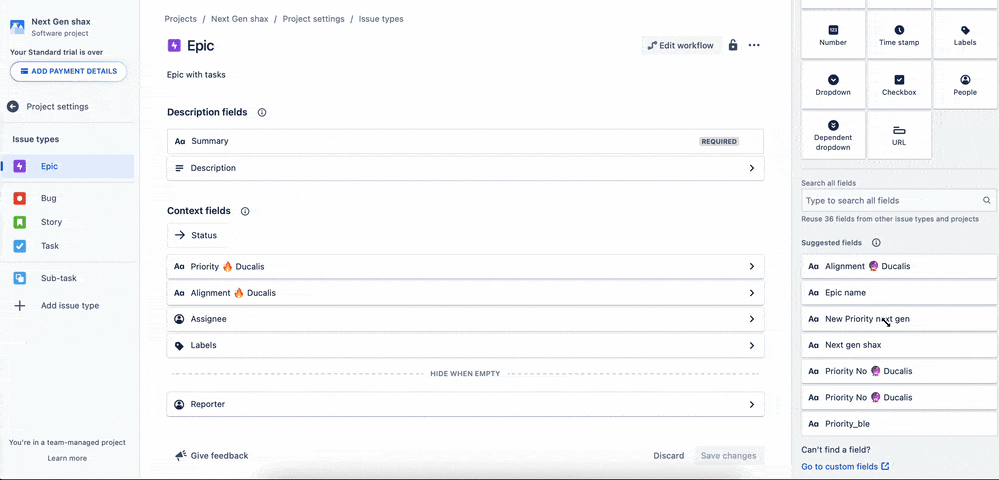 Jira'da zaten özel alanlarınız varsa ve daha fazla oluşturmak istemiyorsanız, Ducalis alanlarını mevcut Jira alanlarınıza eşleyebilirsiniz.