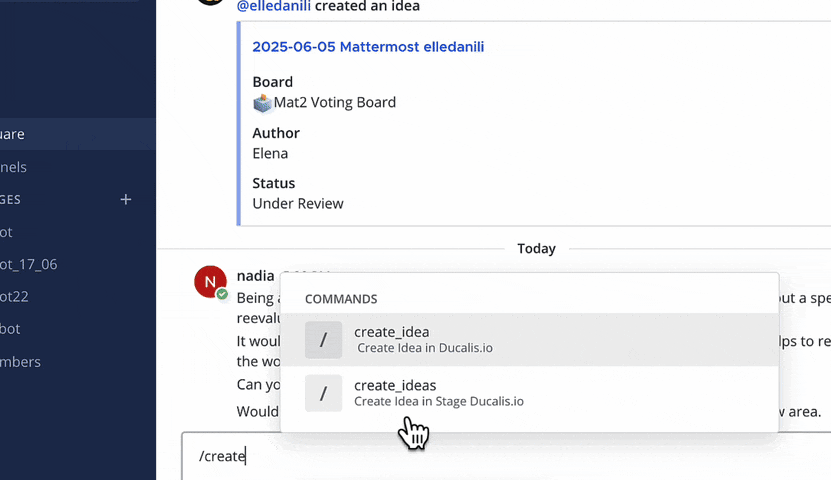 Mattermost hesabınızda ürün geri bildirimi kanallarınız varsa, geri bildirimleri Oylama panonuz için herkese açık fikirlere dönüştürebilirsiniz. Ducalis'in Mattermost ile entegrasyonu, bir Mattermost kanalından herkese açık bir fikir oluşturmanıza olanak tanır.