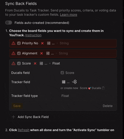 Otomatik (önerilen): Geri Senkronizasyonu açın ve Ducalis alanları YouTrack'te otomatik olarak oluşturur. Manuel kurulum gerekmez.