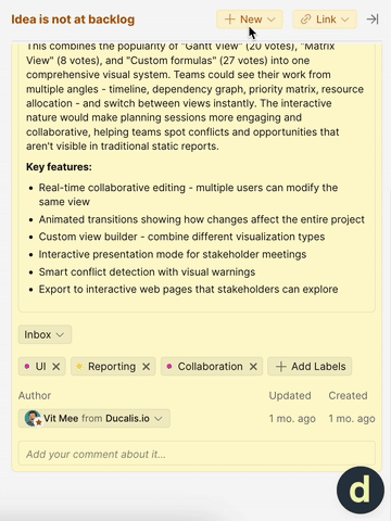 Backlog'da olmayan bir Fikir seçin ve +New (+Yeni) seçeneğine tıklayın.
